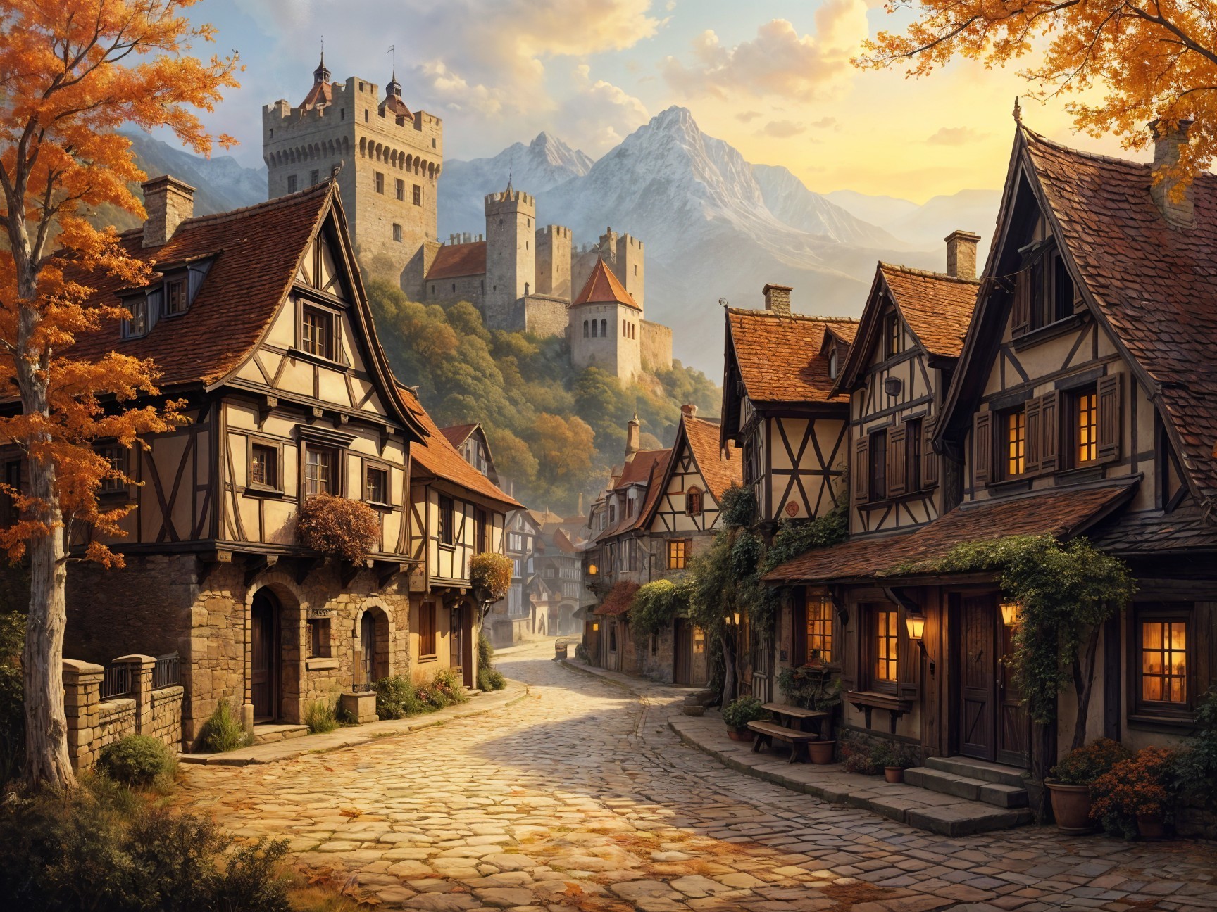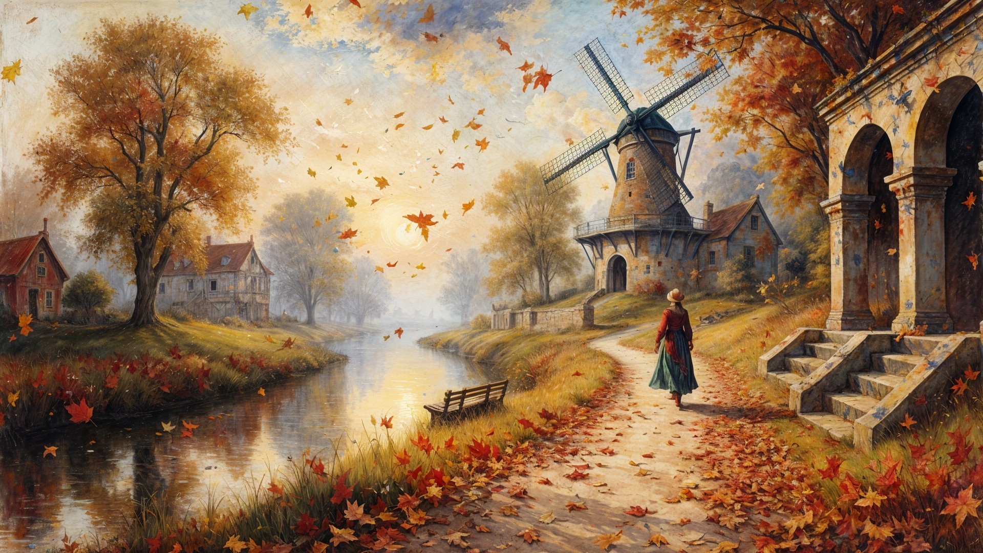 Prompt: William Turner, Pieter Bruegel, HR Giger, and Catrin Welz-Stein acrylic ink and oil on canvas style, surreal, luminous fantasyland autumnscape at misty sunrise, indian summer trees, whimsical houses, windmill, and patches of withered grasses at the river, a maiden walking down a winding path covered with autumn leaves; arched ancient ruins, steps, park benches, vibrant colours of gold, rusty orange, red, green, blue and sandy creme tones, delicate clouds, layered, fragmented, mist, soft focus sky, leafy paint splatter, bold colours, reflections, by Susanne.