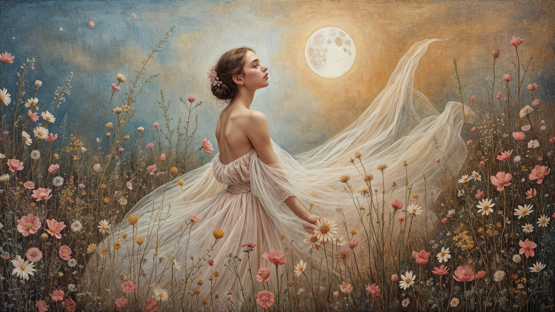 Prompt: Mystical tapestry art by Richard Burlet, ethereal otherworldly setting, young and beautiful HD face of Wildflowers Goddess , simple carefree fashion with gossamer silky textures, dreamy atmosphere, raw dream dimension, intricate details, pastel colour palette, surreal and enchanting ambiance, detailed oil painting technique, mysterious and elegant, moonlit sky, fantasy landscape, by a fusion of Gustav Klimt and J.R.R. Tolkien.