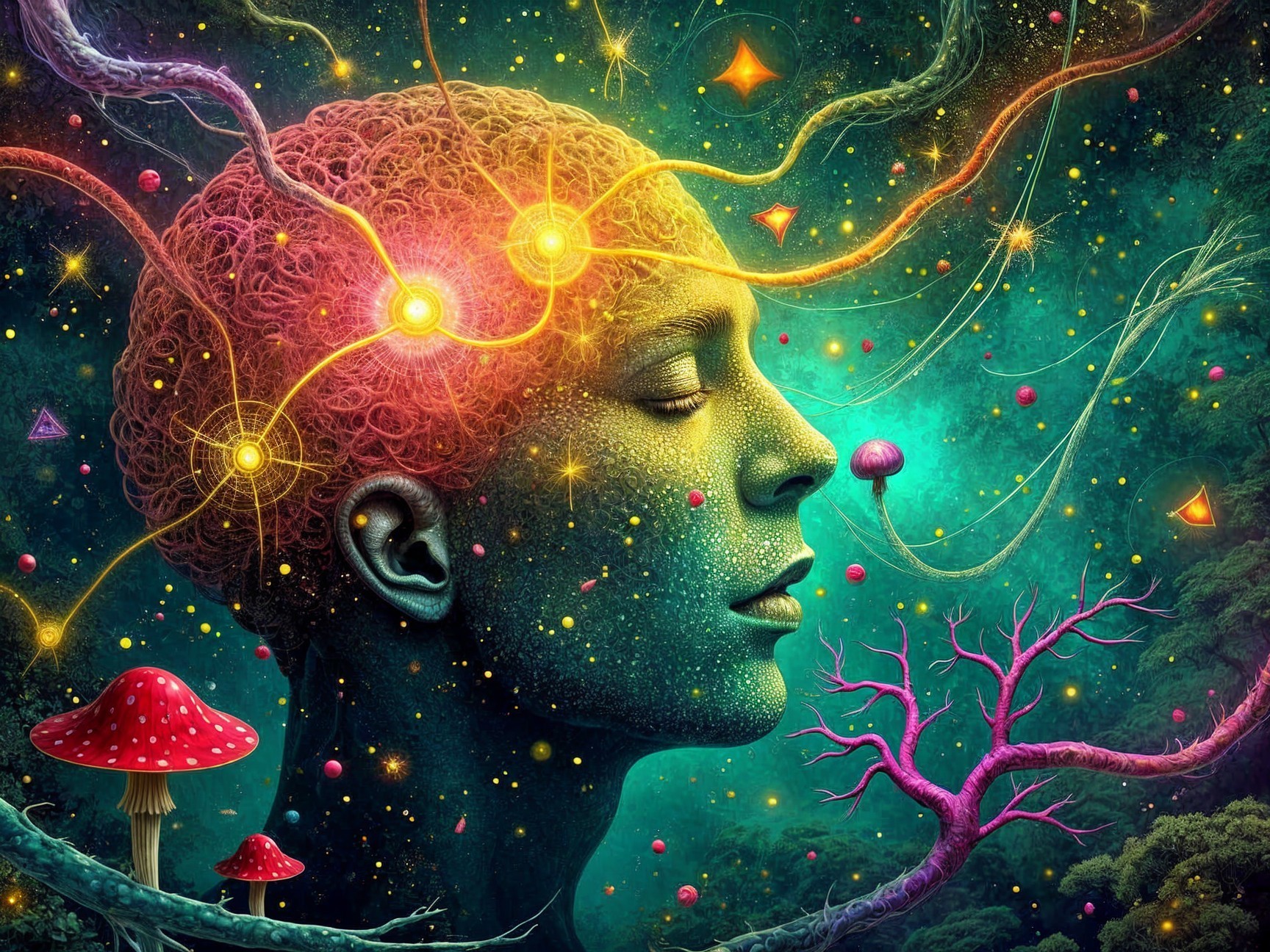 Prompt: (A surreal masterpiece of unparalleled excellence), ((Vivid dreamscape unfolds, brimming with surreal thoughts and floating neurons that drift effortlessly through a tapestry of an abstract cosmic brain. Intricate neural connections weave a mesmerizing web, adorned with colorful, shimmering synapses that pulse with life. This artistic interpretation delves into the mysterious depths of the subconscious, illuminating glowing neurons amid swirling, otherworldly thoughts. Set within an ethereal atmosphere, this digital painting bursts with vibrant colors and imaginative composition, enhanced by dreamlike lighting. The scene invites viewers to journey inside the human brain, where boundless creativity and wonder intertwine)), As if created by Arthur Rackham, Ernst Haeckel, Gustav Klimt, Jean-Baptiste Monge, Kandinsky, Tim Burton. Multilayer Rendering in Highest Resolution !