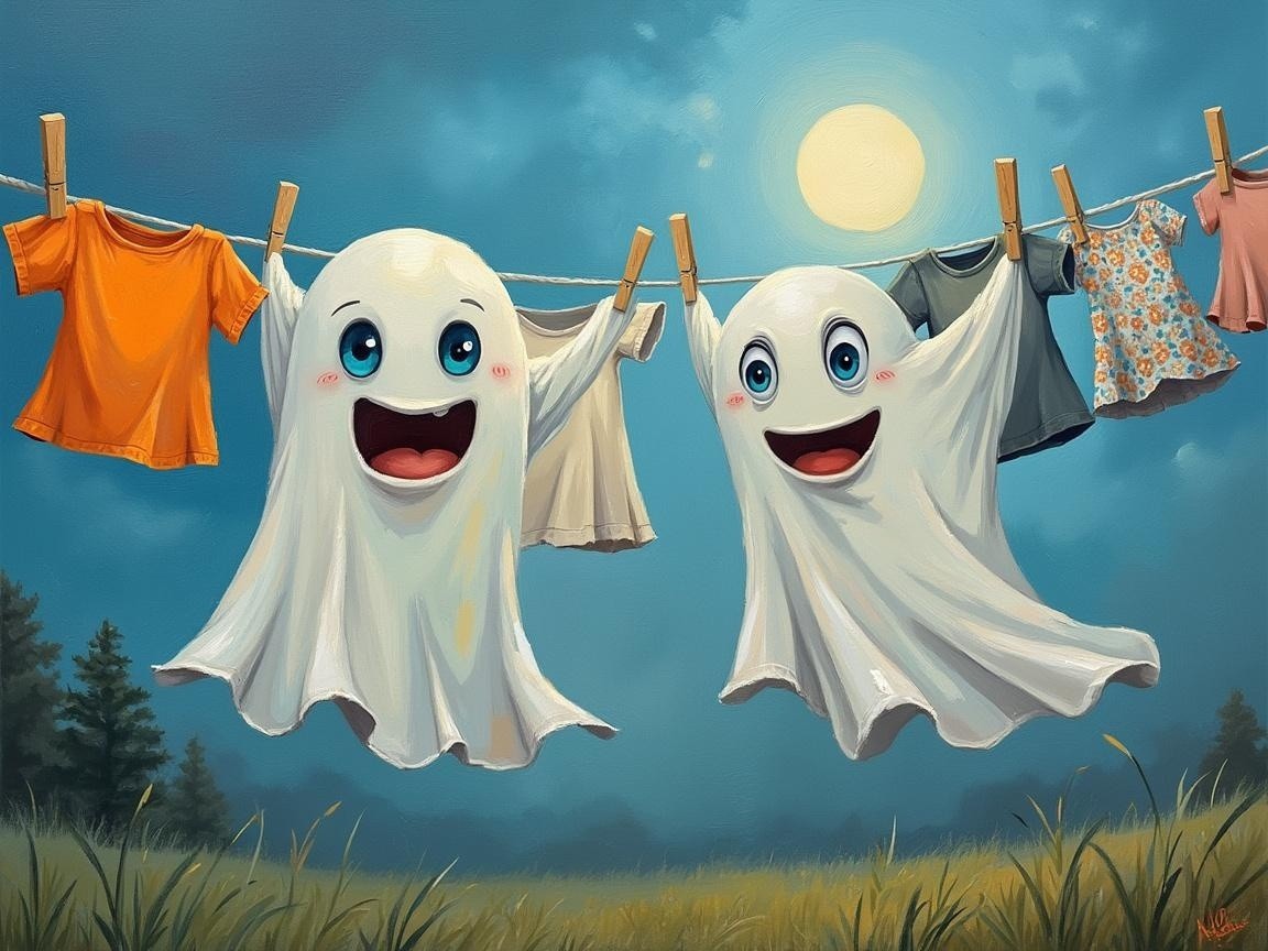 Prompt: Create an oil painting of a whimsical scene featuring two friendly, cartoonish ghosts with cheerful expressions. The ghosts should be depicted playfully, each with large, expressive eyes. In the background, clothes hang on a clothesline. The clothing consists of a mix of light-colored shirts, a bright orange shirt, and a patterned dress, all fluttering gently in the breeze. Hanging among the clothes on the line are two silly ghosts, swaying back and forth in the wind, held by clothespins.