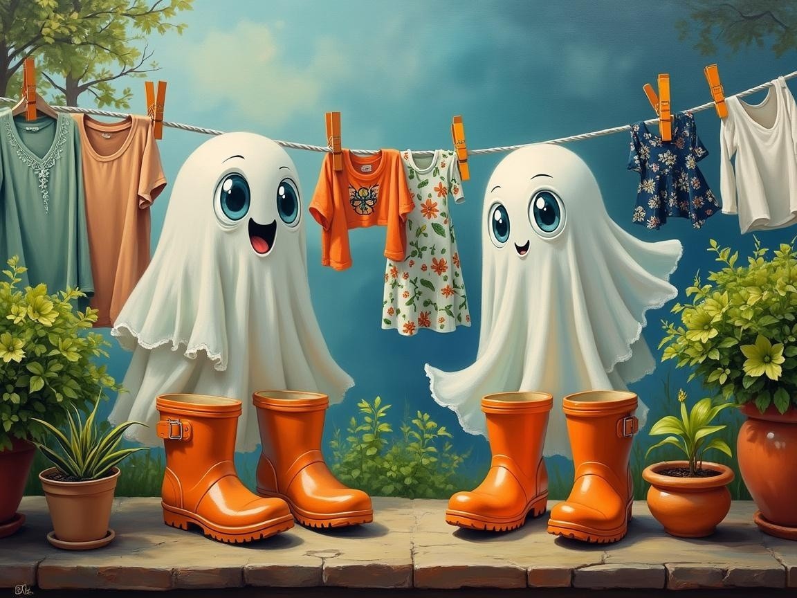 Prompt: Create an oil of canvas of a whimsical scene featuring two friendly, cartoonish ghosts with cheerful expressions. The ghosts should be depicted in a playful manner, with one ghost wearing a small orange hat and both having large, expressive eyes. In the background, there are clothes hanging on a clothesline. The clothing consists of a mixture of light-colored shirts, a bright orange shirt, and a patterned dress, all fluttering lightly as if in a gentle breeze.