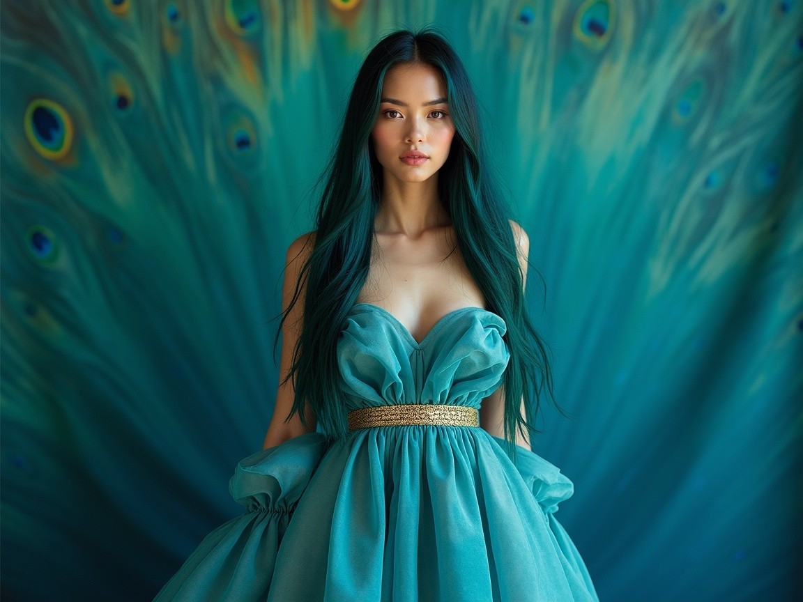 Prompt: "\"Captivating, realistic portrait in a high-fashion, artistic style. A beautiful woman with long, straight, deep teal hair. Her flawless, smooth skin has a natural, clean glow. She is captured in an elegant, full-body standing pose, with a calm gaze. She wears a unique multi-element gown made of countless, overlapping layers of ethereal silk chiffon, each dyed with soft, wet-on-wet watercolor washes in shades of deep teal, royal blue, and shimmering gold, perfectly mimicking the 'eye' of a peacock feather. A simple, thin gold belt cinches her waist. The background is a detailed, abstract macro texture of a backlit peacock feather's 'eye', focusing on the iridescent fibers and deep, blended color gradients. The scene is lit by a single, soft spotlight from above, creating a delicate, focused mood. The scene is captured in a photorealistic style with ultra-detailed, high-resolution clarity.\"gorgeous beauty,féminity and grâce,,glamour and aesthetic,in the style of Luis Gabriel Pacheco, Jean-Baptiste Monge, Harry Clarke, Agnes Cecile, Anna Sui and Richard Burlet, \n"by Medlinyelle
