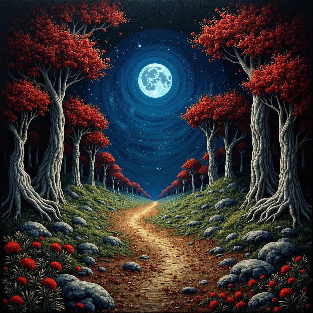 Prompt: ancient mystery : Striking Blue and Crimson, gold,green,Silver landscape,on black backdrop