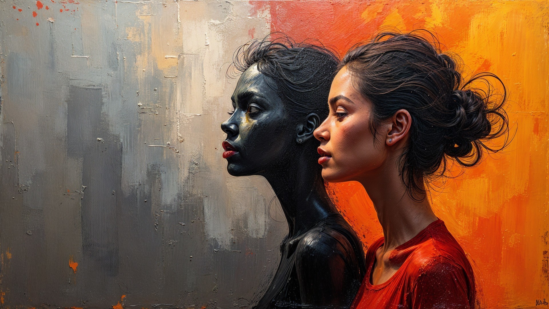 Prompt: Abstract painting with dark texture, expressive brushstrokes, a sense of movement, a soft color palette, subtle tonal variations, dark hues, pronounced textures, multi-layered tones, abstract sculptural realism, cool diffuse lighting, abstract realism, expressionism, impasto technique, masterpiece, most recent, a woman, with her hair partially covering her face, looks to the side, her auburn hair flowing, holding a black cat; contrasting with a desolate, monochromatic landscape, she wears a high-necked black dress, inspired by the Victorian era, with lace ruffles. The style leans toward the Gothic. The overall mood is surreal, creating an atmosphere of ethereal beauty and eerie stillness. The cat stares at the viewer, condemning everyone! It was killed by its neighbor!