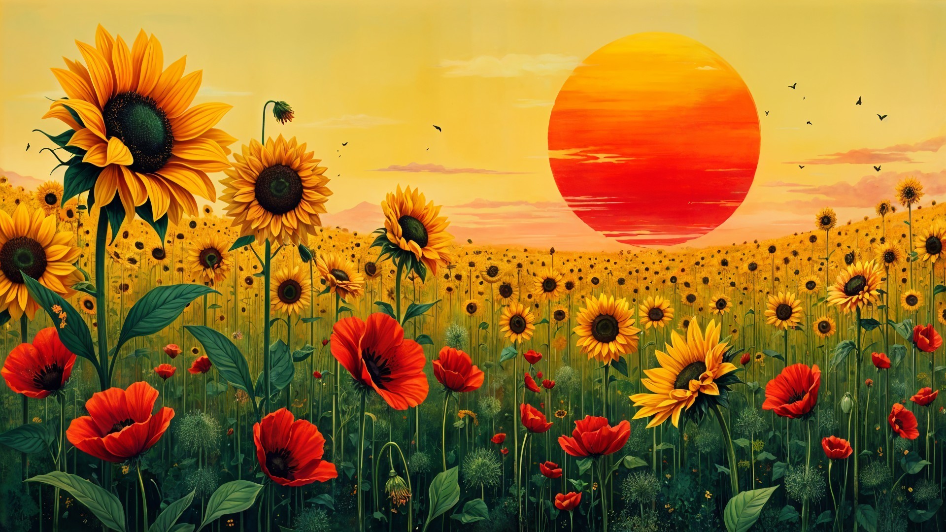 Prompt: A whimsical field of tall sunflowers with large yellow petals and dark centers, and red poppies with delicate petals and green stems, set against a surreal sunset backdrop, with a huge yellow, orange, and red sun in the shape of a tangerine, complete with intricate leaf details, creating an enchanted atmosphere near dusk, extremely detailed, richly layered, ultra high resolution, vivid and vibrant, accented with expressive green ink lines and splashes of violet, the field is in perfect tone harmony, with warm golden light casting long shadows across the lush green landscape.