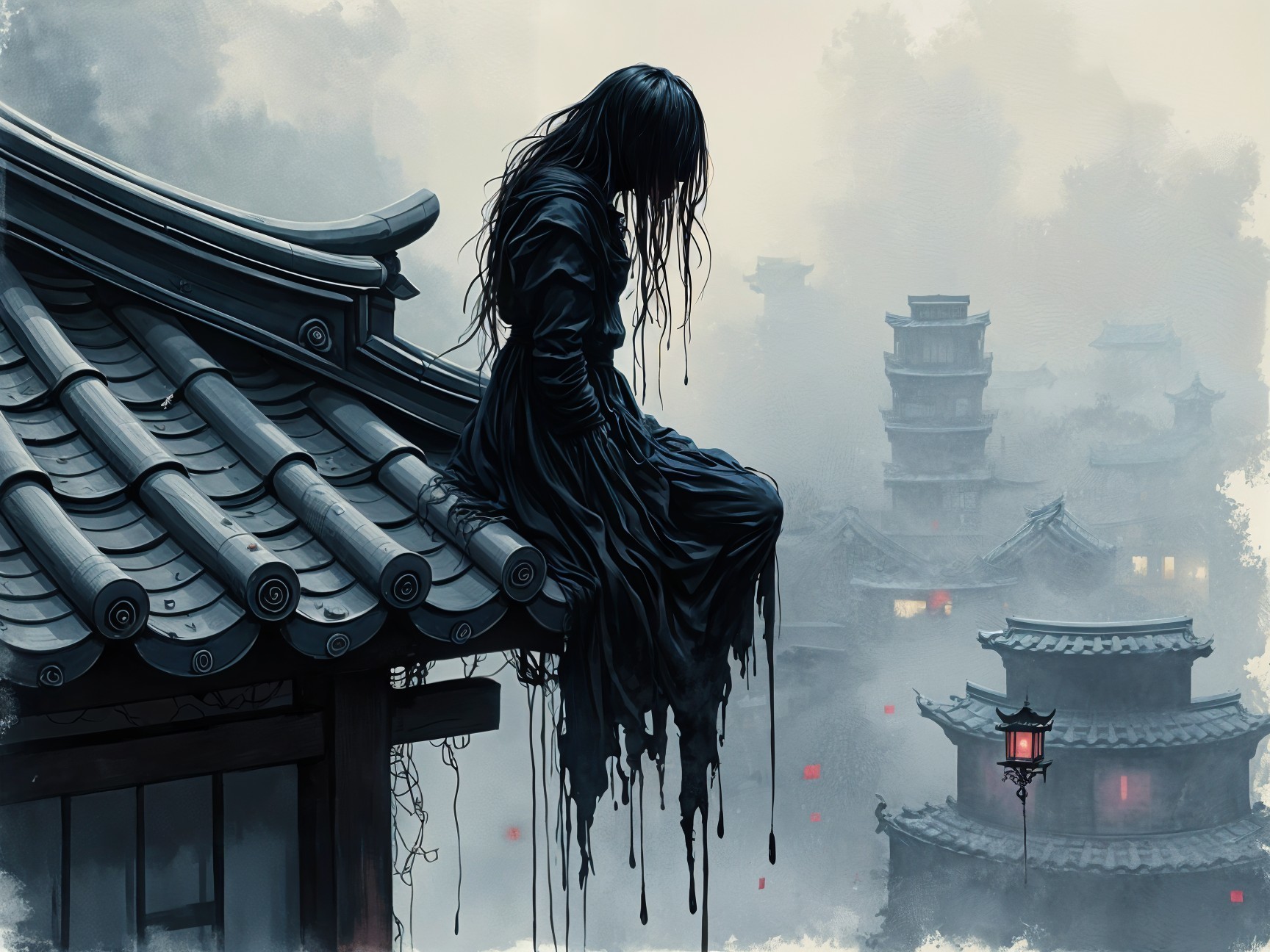 Prompt: An expressive abstract study in ink and watercolor: a young gothic ninja teeters on the edge of a traditional Japanese rooftop. Her dark garments cling to her body and billow in fluid, hazy forms against the misty Halloween night. The folds of her black fabric shimmer faintly, rendered in soft reflections and loose, diffused lines of ink. Her head is tilted slightly; her long, straight black hair, damp and tangled, blends into the dark shadows that gather on the curved tiles. Below her, the city dissolves into the mist: unfinished, indistinct, a haze of blurred grays and watery textures. Subtle strokes of deep crimson and midnight blue merge into the darkness, evoking a haunting, dreamlike atmosphere of solitude, stealth, and quiet resolve.