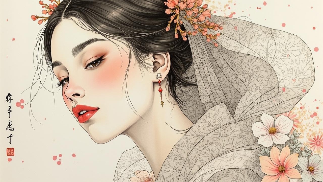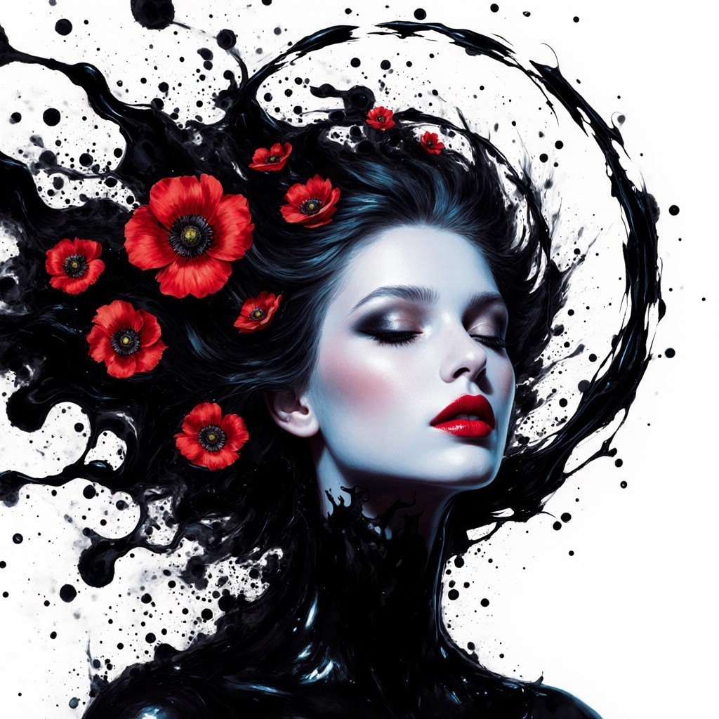 Prompt: An expressive abstract ink-and-watercolour study: a teenage gothic ninja balanced on the edge of a traditional Japanese rooftop, her dark garments clinging and flowing in fluid, smoky shapes against the misty night. The folds of her black fabric shimmer faintly, rendered in soft highlights and loose, bleeding ink lines. Her head is slightly bowed, long straight black hair damp and tangled, merging with the inky shadows that pool along the curved roof tiles. Below her, the city dissolves into mist — unfinished, indistinct, a haze of blurred greys and watery textures. Subtle traces of deep crimson and midnight blue bleed into the darkness, evoking a haunting, dreamlike atmosphere of solitude, stealth, and quiet resolve.