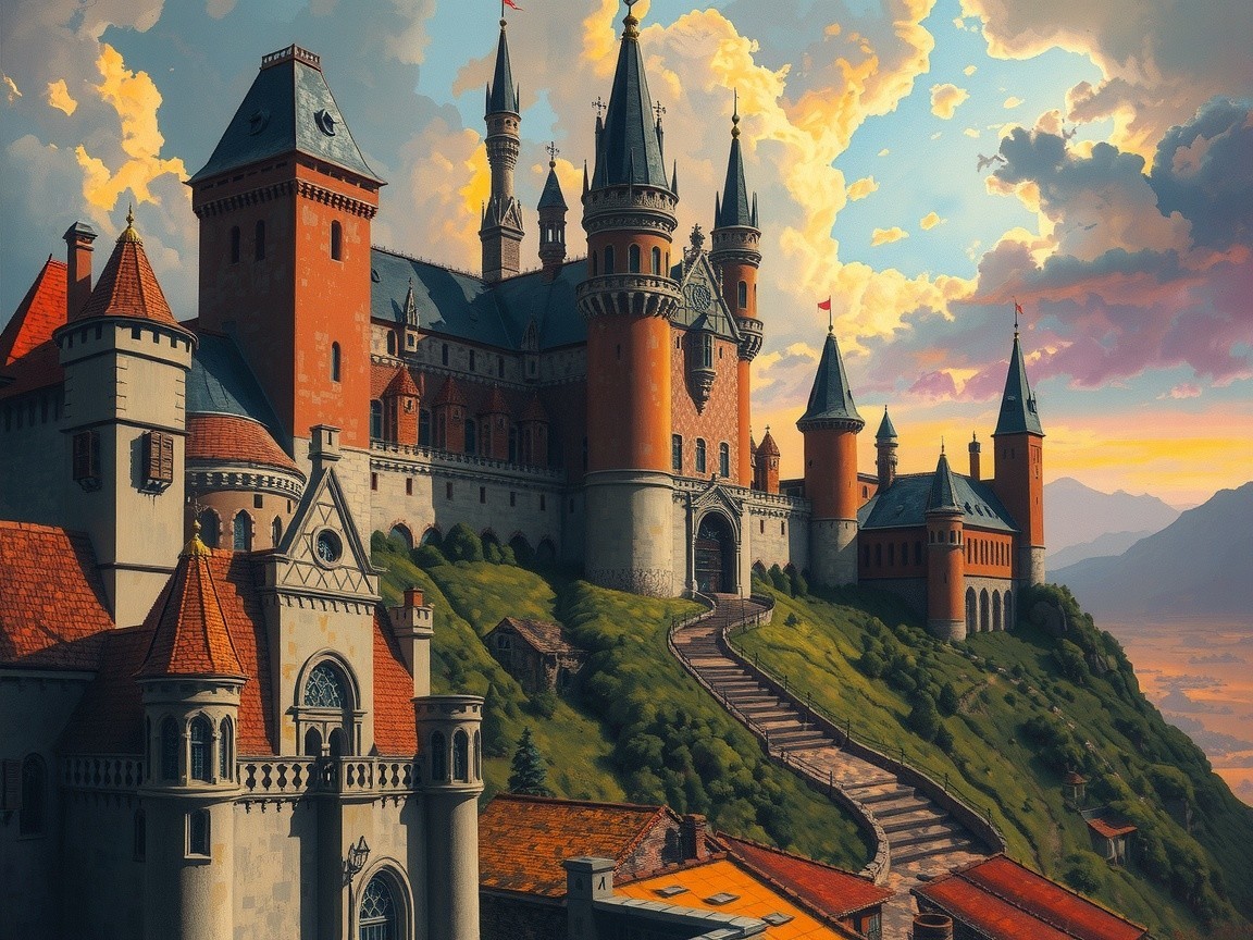 Prompt: Create a photorealistic image of a futuristic, robotic, Victorian-style trike-hybrid with small minarets and turrets with glass windows from which light shines,
