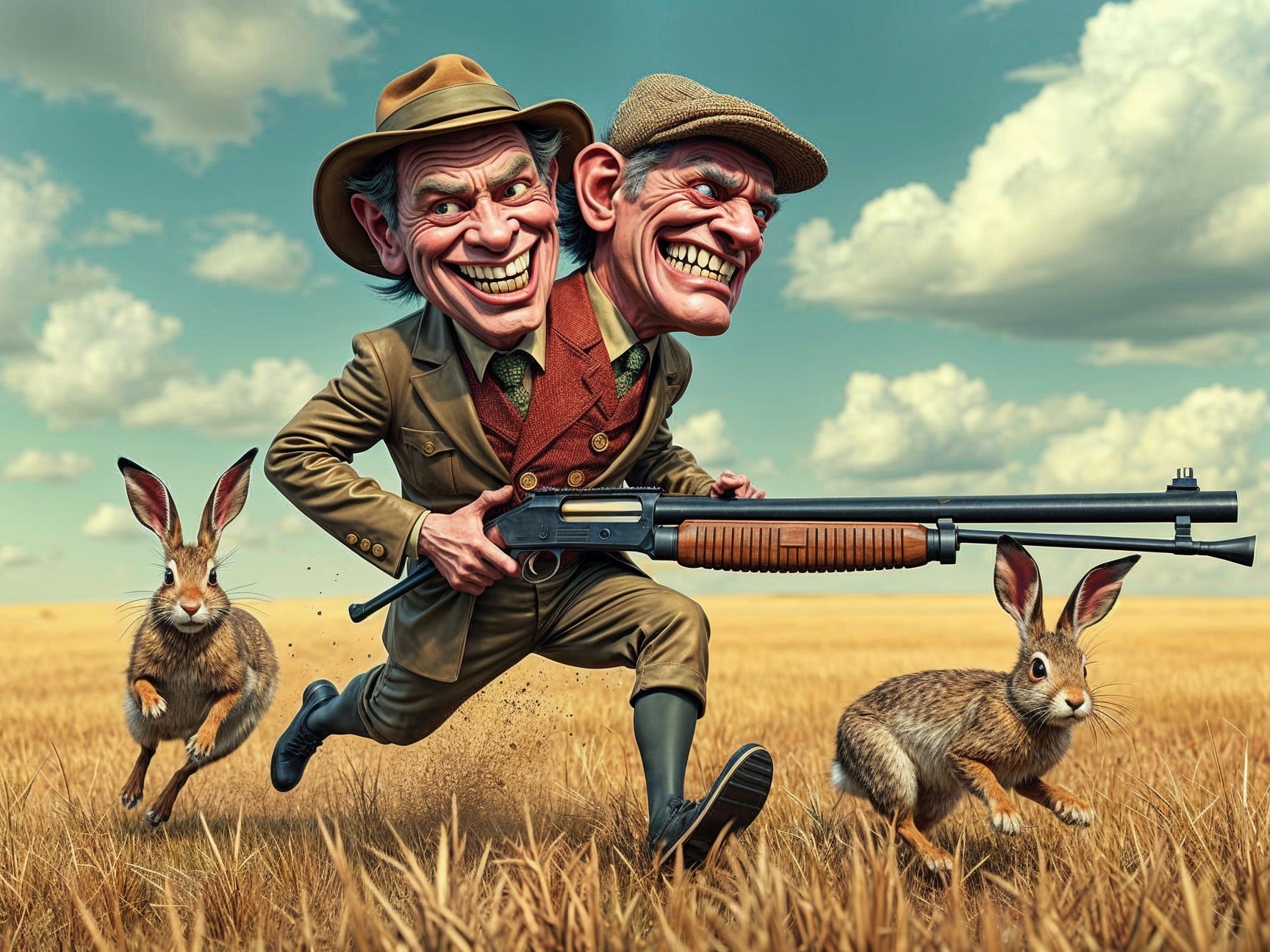 Prompt: A grotesque, satirical, caricature 3D render in the distinctive style of Robert Crumb. A grotesquely grinning "Siamese twin" man in a tight hunting costume is running chaotically across a field, holding a double-barreled shotgun. One of his heads is grinning sarcastically, filled with arrogant confidence, while the other looks on with a skeptical, worried expression, already foreseeing the fiasco. He is chasing two terrified hares that are running in different directions, symbolizing the futile pursuit of two goals at once. The scene is dynamic, absurd, and brightly lit, emphasizing the vulgarity and comedy of the situation. The style is exaggerated, with exaggerated anatomy, cross-hatching textures, and a muted, dirty color palette typical of Crumb's work.