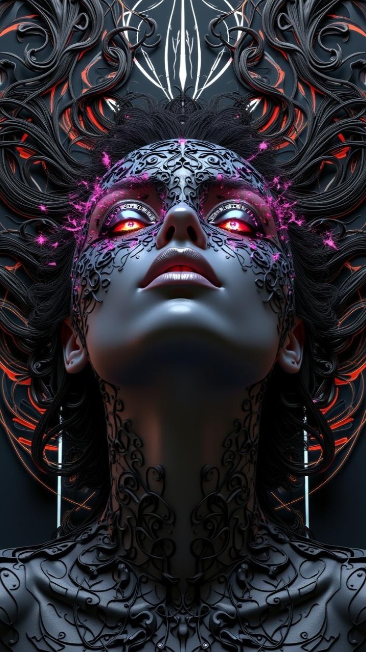Prompt: A stunning render in the captivating style of Olivia De Berardinis depicts an exotic and provocative satin black skin feminine being, meticulously formed entirely from intricate digital clocks with RGB numbers forming a breathtaking mask-like body and visage; her luscious RGB lips and intense, RGB eyes are seamlessly integrated into the intricate digital clocks with RGB numbers design, mirroring the flawless contours of her body parts and face. Cascading, RGB silky hair flows gracefully, catching the warm light in a mesmerizing display of color and texture against the scene of a chaotic tapestry of shattered RGB numbers flying around her, illuminated by an eerie, pulsing glow, rendered in a dark, ethereal, surreal art style, utilizing hyperdetailed airbrush and ink drawing techniques with flowing paint and alcohol ink drips to create a rough texture, with exquisite detail, featuring lifelike textures, vivid color gradations, and atmospheric lighting, evoking a blend of Olivia De Berardinis' exotic touch, Thomas Kinkade's shading, Greg Rutkowski's symbolism, and Alphonse Mucha's lines. The 3D backdrop consists of an intricately designed emblem with dramatic color contrast against a black and grey shaded background, accented with white curving lines.
