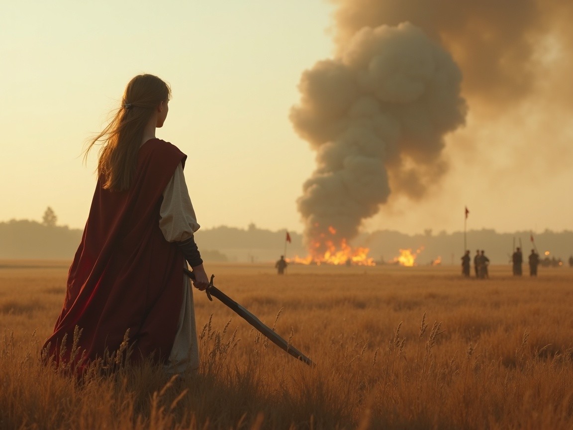 Prompt: A simple country girl in medieval times becomes a warrior for her nation clad in farming attire. She stands alone in a field, gazing out at the smoke rising from a battle far away.