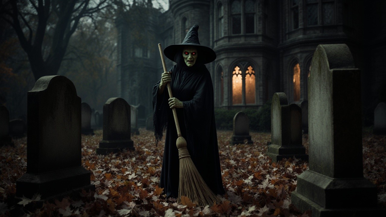 Prompt: Very creepy, absolutely photorealistic scene with a bitterly evil witch who, with her witch's broom, sweeps the autumn leaves from the graves in the cemetery yard of the old Victorian manor house and waits for the graves to open and the undead to rise from them and spread fear and terror on Halloween night. Eerie lights, haunting and creepy atmospheric image.