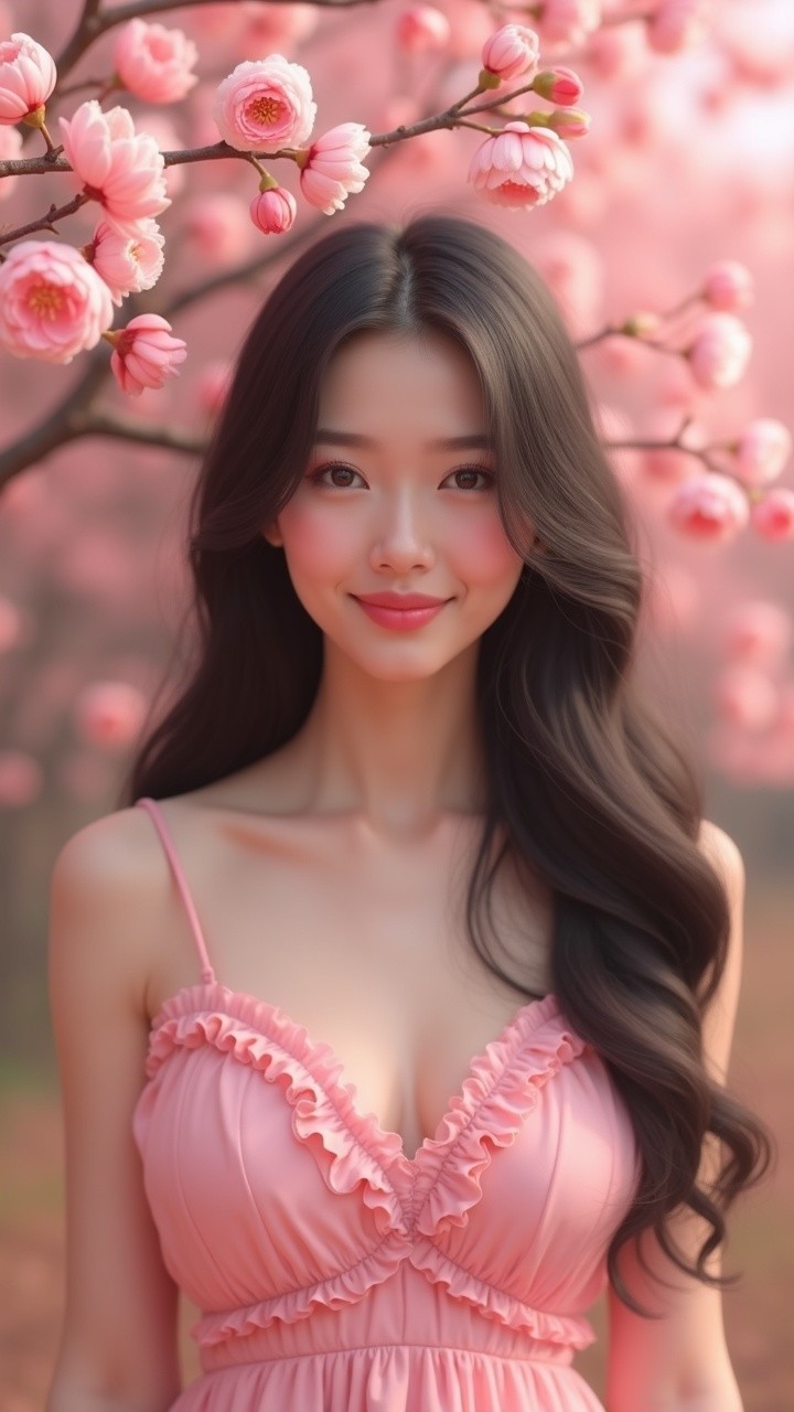 Prompt: A hyper-realistic, vibrant, vivid dress, texture, detailed, ((full-body front view, perspective)), show legs, photograph of a happy girl, in a blooming garden. She is has a (((very long))), black hair and expressive eyes, ensuring are perfectly round and centered, with black pupils for a natural and symmetrical appearance. Delicate a pink cherry petals fall down, circling around her, showcasing The image emphasizes her femininity with detailed muscle definition, rendered with advanced lighting, high-resolution details, and a cinematographic quality reminiscent of Mark Mann and Steve McCurry. The focus is sharp, with UHD 32K, HDR, and 64 megapixels, The background is clean and well-lit, highlighting her features without distractions. Octane render.