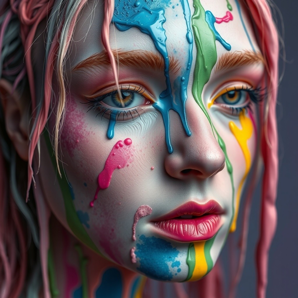 Prompt: A beautiful, ethereal face covered in vibrant, melting paint in shades of pink, blue, green, and yellow, with a dreamy or melancholic expression