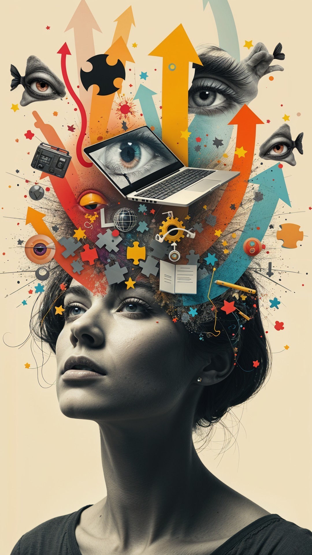 Prompt: Vivid bright vibrant color splash in a digital surrealist collage featuring a vintage black and white portrait of a woman's head with intricate facial features and smooth skin tone, from which emerge elements representing marketing and automation, including bold arrows, puzzle pieces, floating eyes with defined iris and pupil, a laptop with typing hands and visible keyboard, connecting lines, interlocking gears, dynamic graphics, and geometric figures in various shapes and sizes, all blended in a vintage collage style with a mix of vintage and modern textures, set against a minimalist pastel background with soft hues, where the black and white head and elements coexist in balance, creating a striking contrast between monochrome and vibrant colors.