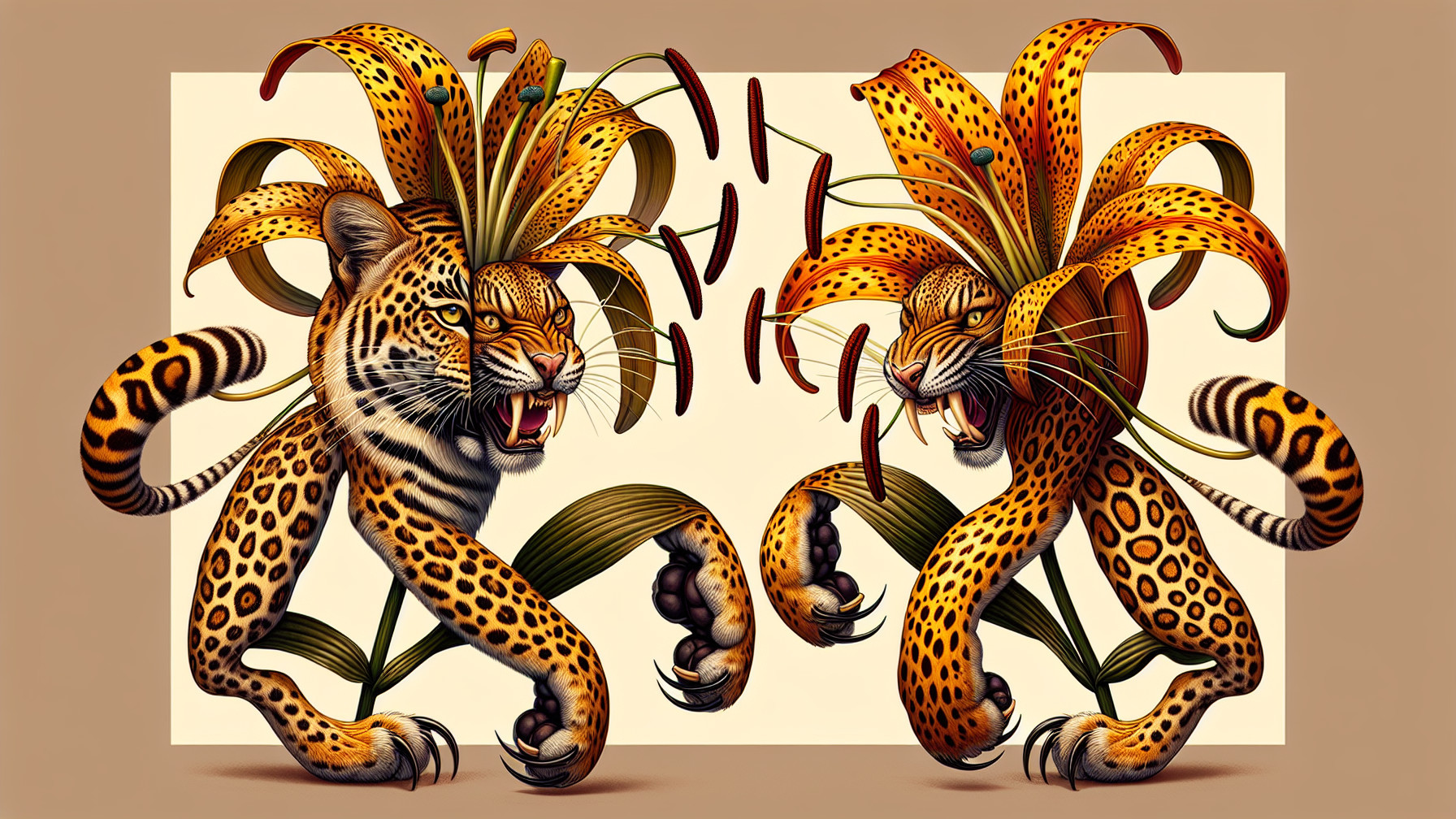 Full width 16:9 biological panel illustration filling the entire image width of a hybrid leopard (panthera pardus) x tiger lily (Lilium lancifolium) creature. The hybrid has the shape of a stem of lilies with the pistils made of tiger claws. A tiger head and face looks out frontally exactly from the center of each lily flower, and perfect tiger stripes decorate each petal. The creature is a full fusion of lily flowers with tigers, so that the dangerous tiger fangs and claws on each lily flower will prey on any insect unfortunate enough to land on the flower. The breathtakingly unusual hybrid is a biological oddity portrayed in extreme detail with visible, splashy marks of colored pencil hatching executed with painstaking precision. The background in exquisitely tiger striped patterned in copper, cream and black. The several hybrid leopard lilies growing from a flowerbed are rendered in tiger stripe zentangle patterning, executed with strongly visible hatching marks by the colored pencils. At the edge of the full-width illustration, the hatching marks exhibit beautiful zendoodling patterning in the style of Visoth Kakvei. The fully melded hybrid creature is illustrated in a style resembling that of biology illustrators Ann Swan and Jillian Dittner and fills the entire width. Astonishing, singular, dangerous hybrid, extremely detailed, intricate illustration. The hybrid creature is illustrated in a style resembling that of biology illustrators Ann Swan and Jillian Dittner and fills the entire panel. The main colors of the creature are various golds, browns and blacks, with the contrasting dark terra cotta patterning behind the flower creature fading toward gold leopard-spot zendoodling patterning in the style of Visoth Kakvei toward the edges. Astonishing, extremely detailed, intricate illustration of a dangerous plant-animal hybrid.