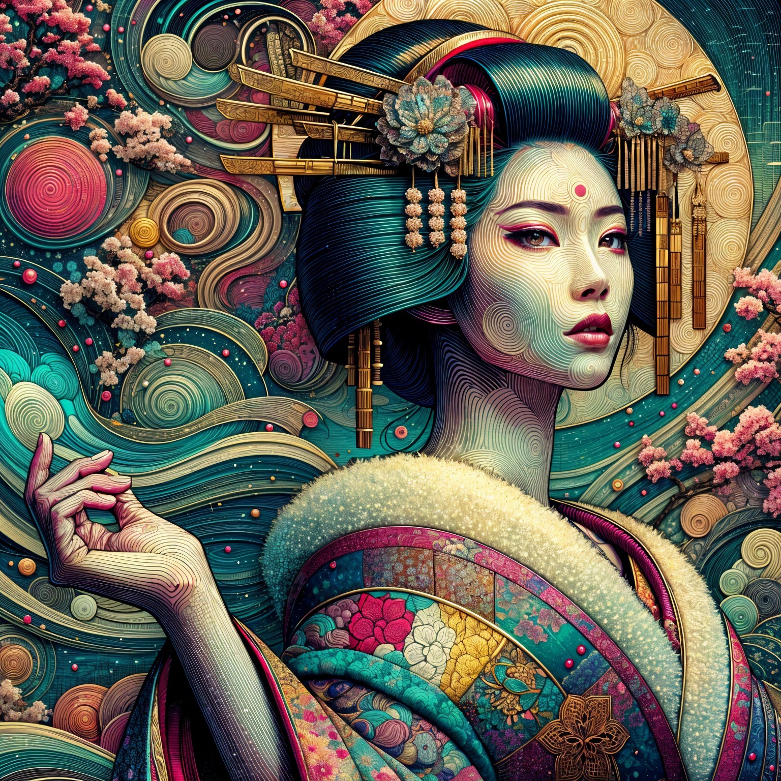 Prompt: "Ethereal portrait of a beautiful ancient geisha princess" & Iridescent Andean Patchwork & By Stephen Bliss (artist) & Frank Miller (artist) & ∞