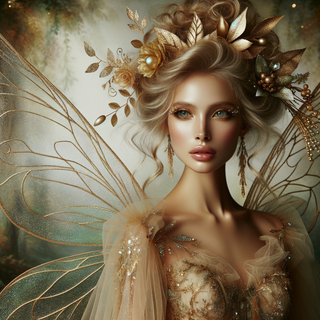 Prompt: Create an enchanting fantasy scene featuring a fairy in a mystical forest. The fairy has a delicate and ethereal presence, with golden, shimmering, translucent wings that are large and intricately detailed, resembling leaves with gentle curves and sparkling accents. Her skin tone is fair, giving her an otherworldly glow, and she has a graceful body shape that conveys elegance and poise.