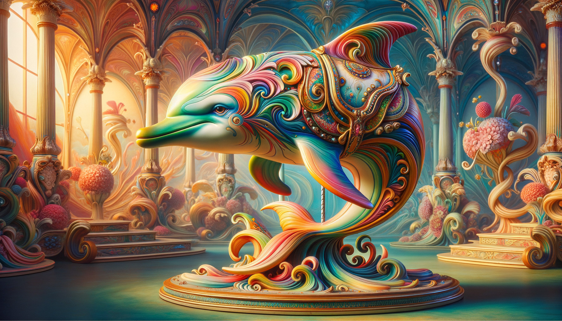 Prompt: fantasy gypsy carousel dolphin, carved and painted wood fantasy full body multi-colored, bright cheerful, tertiary colors dolphin carousel animal, stylized for the delight of children, patchwork painted all over it's body with flourishes and flowers, side view with saddle