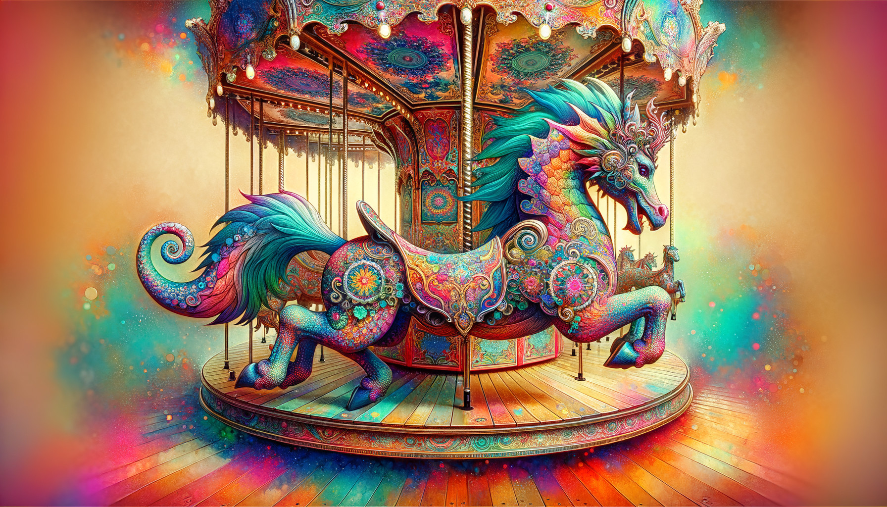 Prompt: fantasy gypsy carousel, carved and painted wood fantasy full body multi-colored, bright cheerful, tertiary colors dragon carousel animal, stylized for the delight of children, patchwork painted all over it's body with flourishes and flowers, side view with saddle