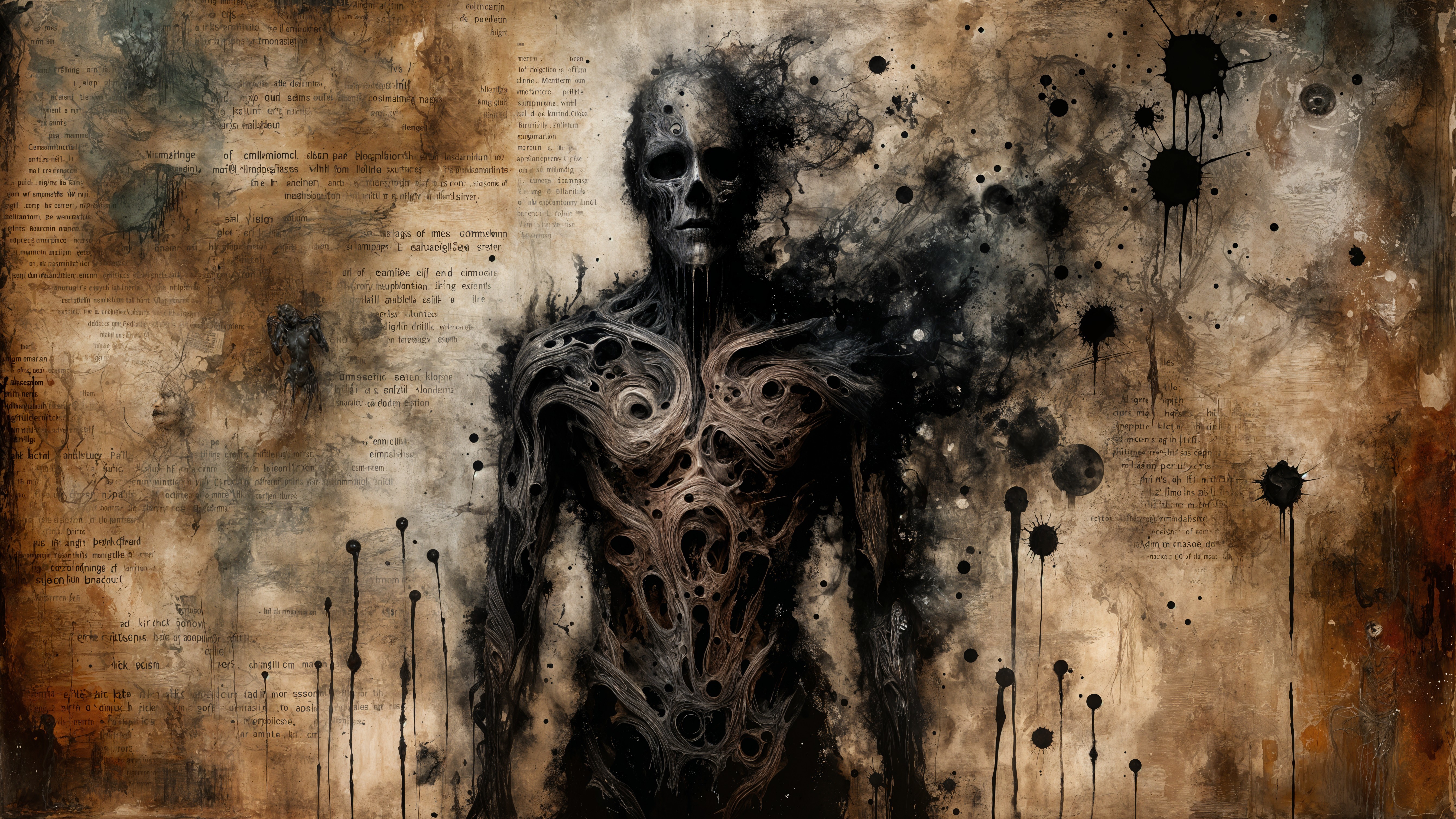 Prompt: Oil painted image of A dark, haunting figure dissolves into cracked textures and ink splatters, standing in a surreal, decaying world. The humanoid form appears fragmented, as if eroding from within, surrounded by cryptic text and abstract stains. The background is gritty, like aged paper soaked in time, evoking themes of decay, vulnerability, and existential disintegration, in the style of dark surrealism.