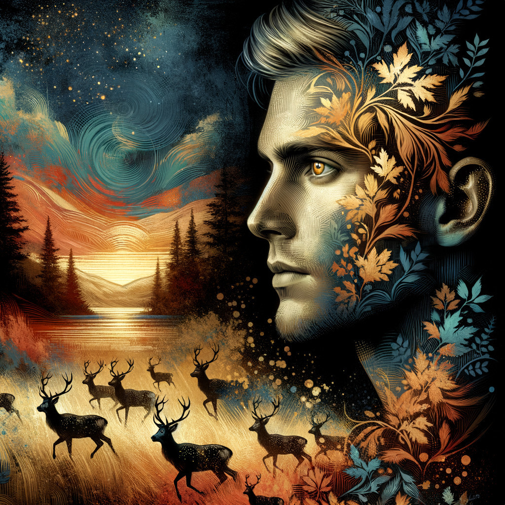 Prompt: A double exposure style man and women 8, ( various deer passing through various landscapes) The bear has blue eyes with gold sparkle, looking at you affectingly, highly detailed, Arthur Rackham, Paul Barson, Paul Lovering, masterpiece, color print art, sunset, vibrant, black background