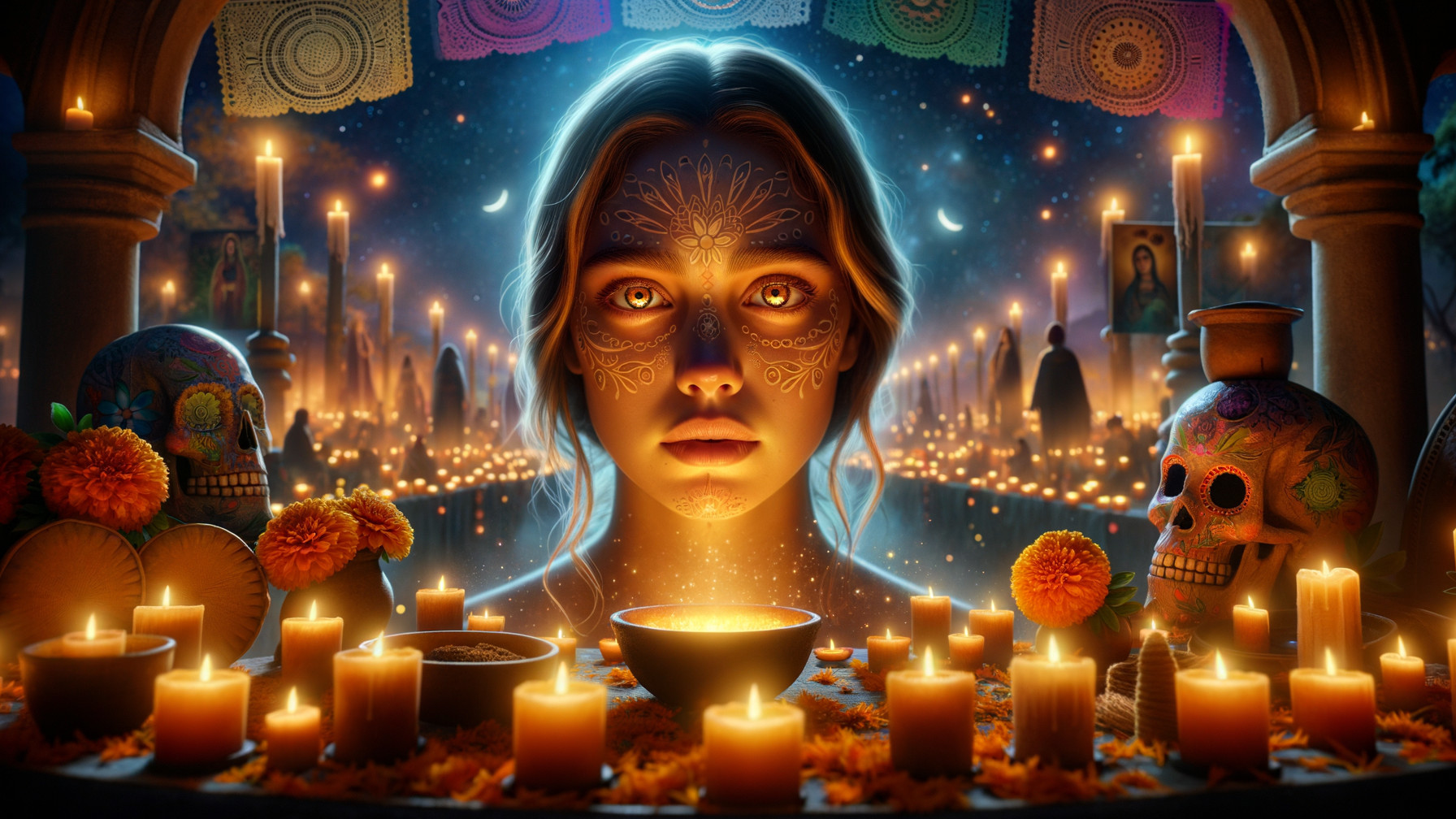 Rodeada de elementos emblemáticos del Día de Muertos, entre altares decorados con cempasúchiles, velas encendidas, papel picado de colores vivos, calaveras pintadas con delicados detalles y ofrendas humildes como pan y agua en vasos de barro, la mujer parece ser el centro de un santuario espiritual. Detrás de ella, la oscuridad de la noche está salpicada de luces, estrellas lejanas que simbolizan las almas de los seres queridos. Una luna llena ilumina delicadamente la escena.