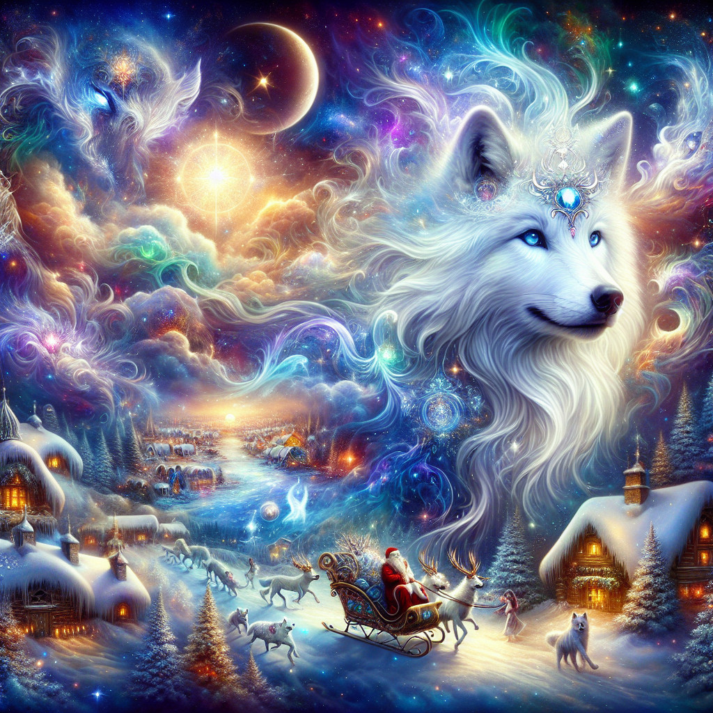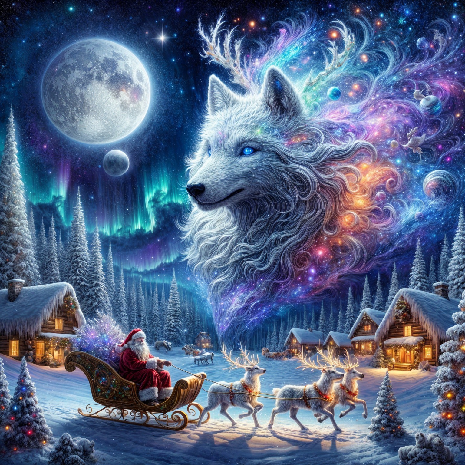 Prompt: A fantastical winter scene featuring a majestic, ethereal white wolf with flowing mane made of cosmic colors, such as blues, purples, and glittering stars. The wolf is surrounded by swirling clouds and celestial elements, including stars and planets. In the foreground, a traditional wooden sleigh is being pulled by sparkling reindeer, with a joyful figure reminiscent of Santa Claus seated in the sleigh. The background showcases a serene snowy landscape with quaint, illuminated cabins nestled among frosted evergreen trees, all under a vibrant, magical sky filled with swirls of northern lights.