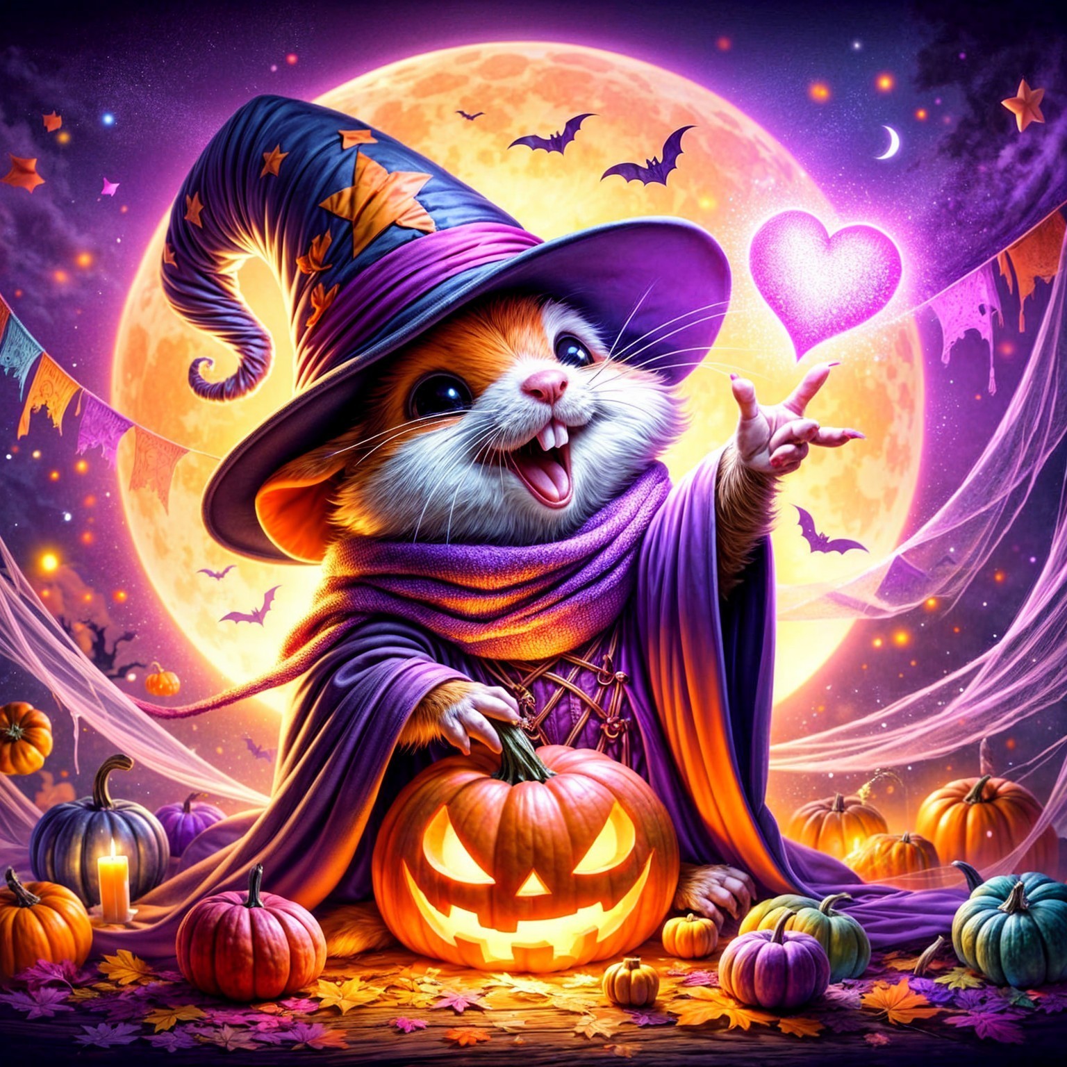 Prompt: A cheerful cartoon mouse wearing a wizard's hat and cloak, holding a heart-shaped gesture with one hand. The background features a glowing full moon and floating Halloween decorations like a pumpkin. Bold, festive text reading "Happy Halloween" is incorporated into the scene, adding to the whimsical and playful atmosphere. The overall color palette is bright, with purples, oranges, and yellows to evoke a fun Halloween spirit.