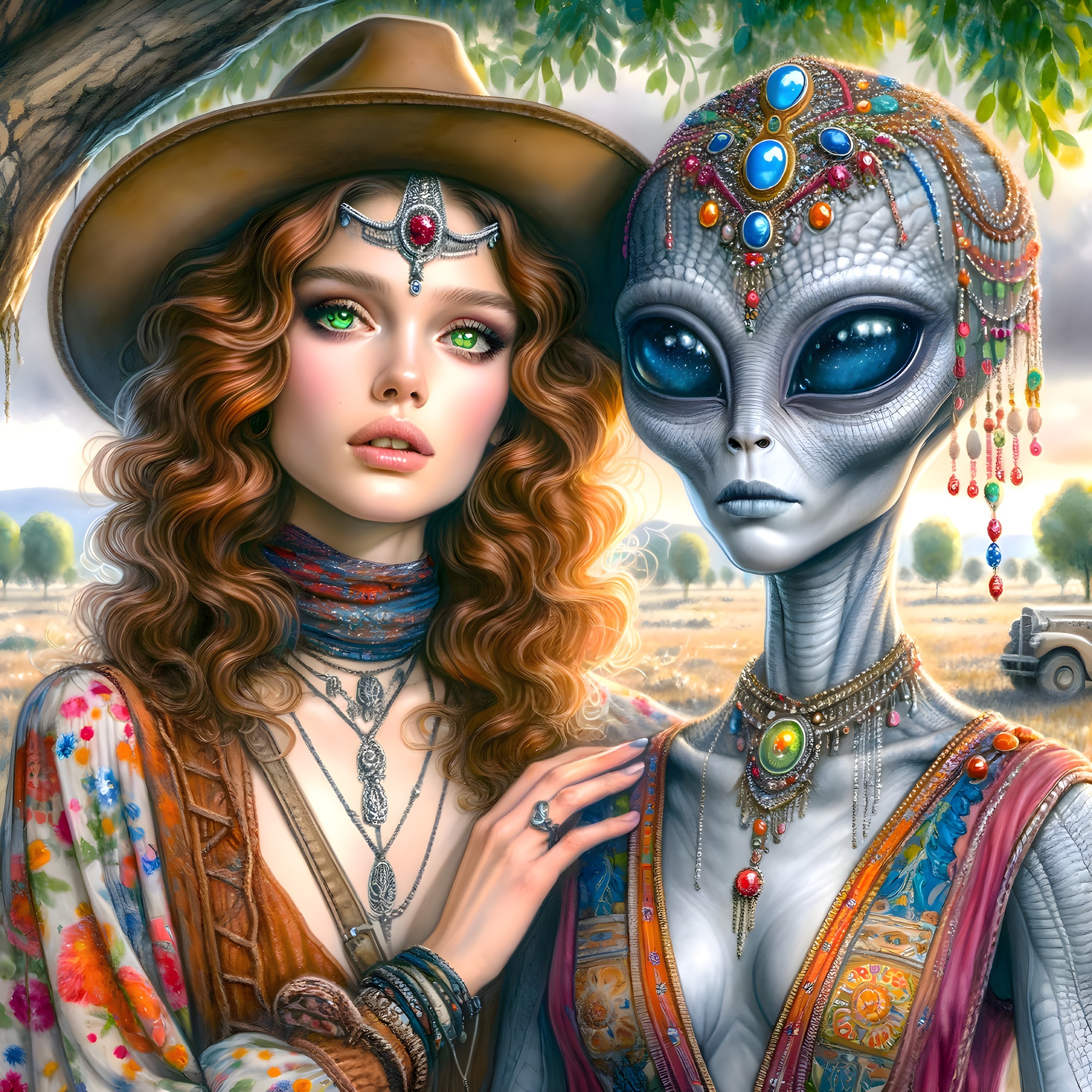 Prompt: Delicate pastel watercolor, ink brush, wet-on-wet oil, and watercolor. Two young women, one with red curls and green eyes, in boho clothing and cowboy boots; the other, a beautiful young alien, with light gray skin and large, sparkling dark blue eyes. Her beautiful features are reminiscent of humans. She has a slender neck and arms, long, graceful hands, and slender, elongated fingers. She wears an elaborate headdress adorned with jewels and patterns and a colorful fabric. They both enjoy a quiet moment. They sit beneath a tree, surrounded by flowers, against a landscape. Style by Jean-Baptiste Monge x Dominic Qwek x Pascal Blanche x Neville Page