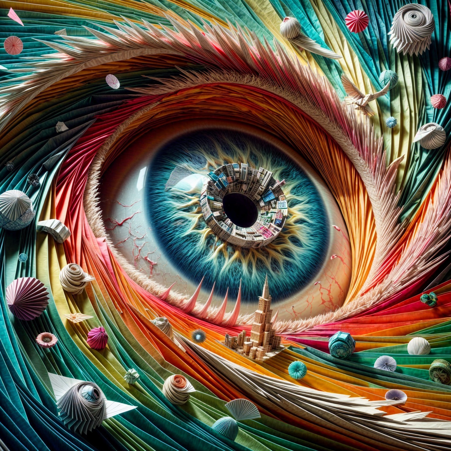 Prompt: A surreal scene depicting a giant, disembodied human eye (MADE FROM ORIGAMI PIECIES) floating above a swirling vortex of colorful, layered paper. The iris of the eye contains a miniature, detailed diorama of a sci-fi city, built entirely from folded paper. The overall effect is dreamlike and slightly unsettling, with a strong sense of depth and texture.