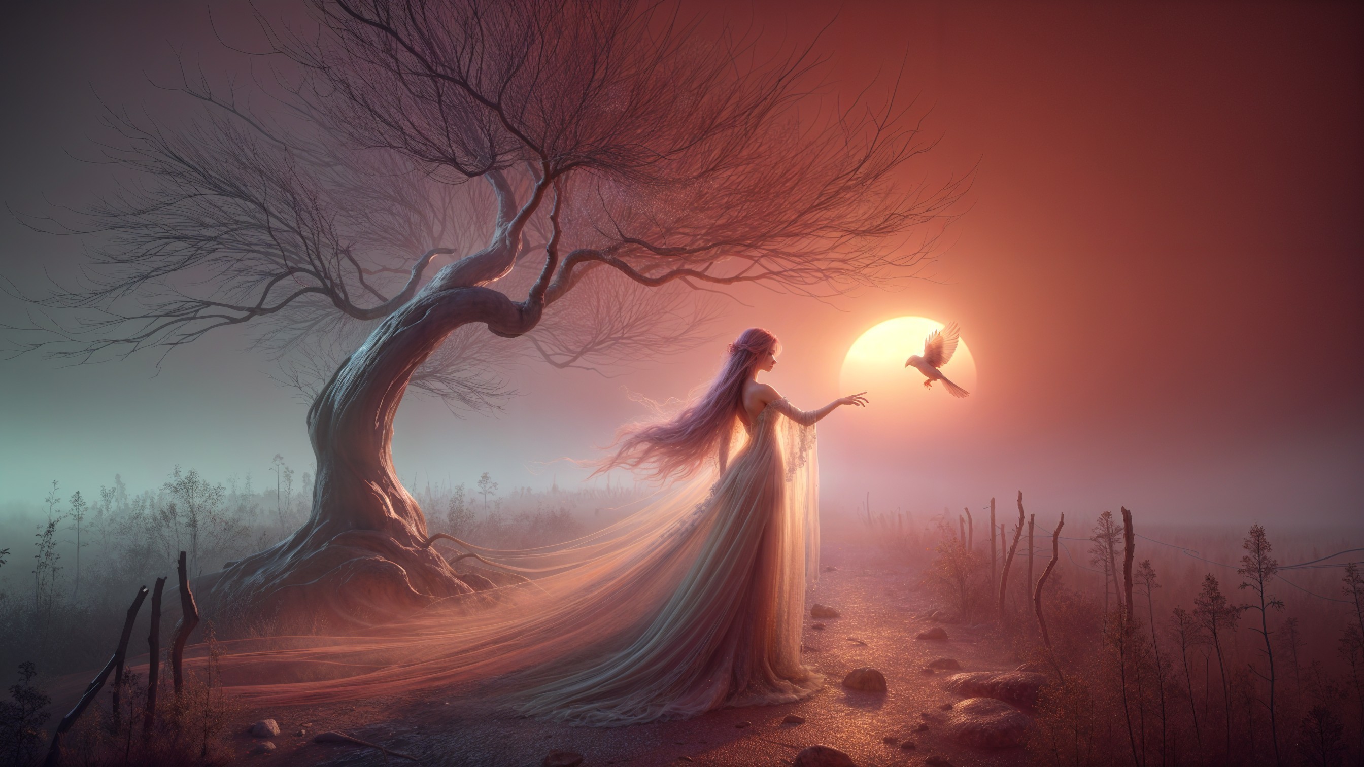 Prompt: Ethereal watercolor painting, wet-on-wet style, soft gradients and bleeding colors, blurred details and hazy outlines. A graceful woman in a translucent gown with long flowing hair reaches toward a bird about to land on her hand. A low red sun glows through morning mist, casting gentle shadows beside a single bare tree. Dreamlike, indistinct, poetic atmosphere, soft focus, misty and surreal. detailed matte painting, deep color, fantastical, intricate detail, splash screen, complementary colors, fantasy concept art, 8k resolution trending on Artstation Unreal Engine 5