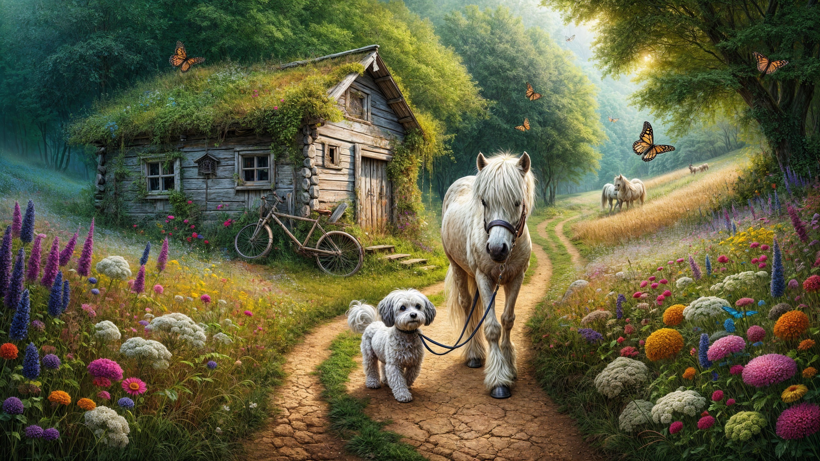 Prompt: A serene countryside scene features a dirt path winding through a vibrant meadow filled with colorful wildflowers. On the left, a dilapidated wooden cabin with a rustic charm and overgrown vegetation serves as a backdrop. A small, adorable, fluffy white dog with a black patch on its forehead is walking alongside a miniature horse. The dog has curly fur, dark eyes, and a curious expression, while the horse is light beige with a bushy mane and big, gentle eyes.