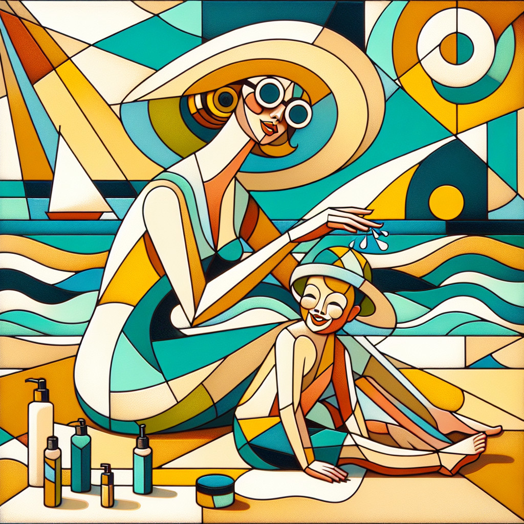 Prompt: A stylized cubist beach scene depicting a woman applying suntan lotion on a child’s back. Both figures are formed from angular shapes, bold outlines, and fragmented planes of color. The woman wears large round sunglasses and a wide sunhat, while the child sits playfully in the sand. The background features abstracted waves, golden sand, and a vivid turquoise sky filled with floating geometric patterns. The composition is vibrant, modern, and expressive — a mix of Picasso-inspired cubism and contemporary coastal art.