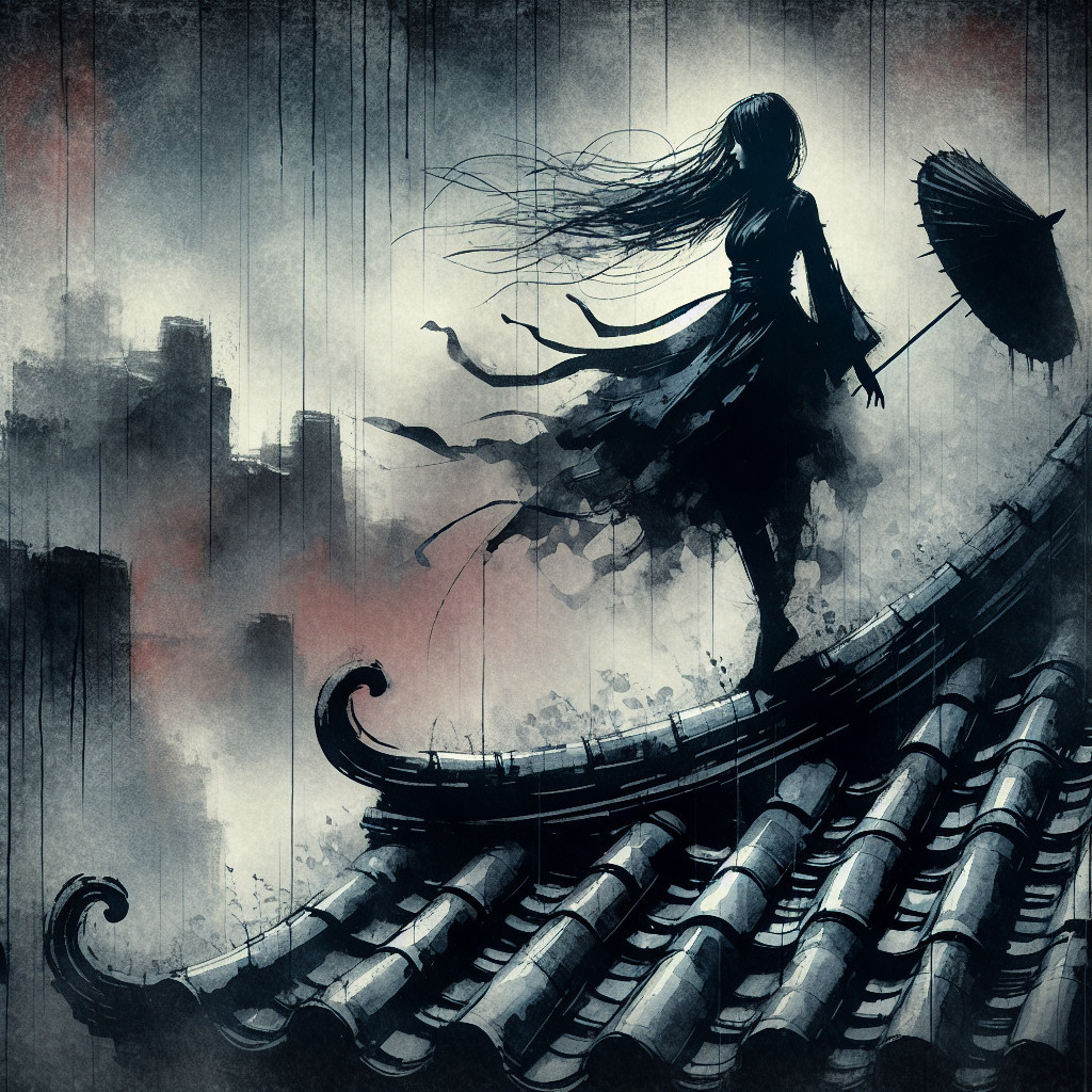 Prompt: An expressive abstract study in ink and watercolor: a young gothic ninja teeters on the edge of a traditional tile rooftop. Her dark garments cling to her body and billow in fluid, hazy forms against the misty Halloween night. The folds of her black fabric shimmer faintly, rendered in soft reflections and loose, diffused lines of ink. Her head is tilted slightly; her long, straight black hair, damp and tangled, blends into the dark shadows that gather on the curved tiles. Below her, the city dissolves into the mist: unfinished, indistinct, a haze of blurred grays and watery textures. Subtle strokes of deep crimson and midnight blue merge into the darkness, evoking a haunting, dreamlike atmosphere of solitude, stealth, and quiet resolve.