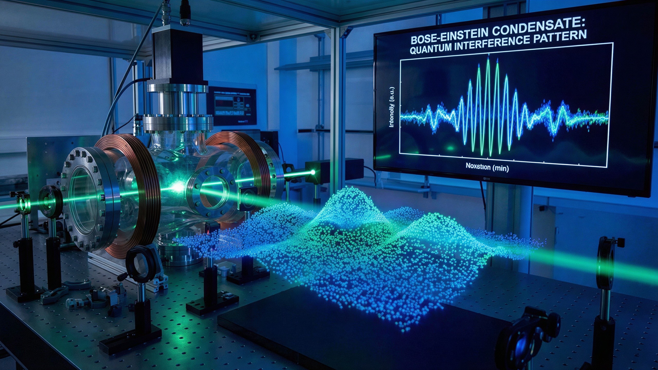 Prompt: A Bose-Einstein Condensate (BEC) is a unique state of matter where atoms, cooled to near absolute zero, lose individual identities and behave as one single quantum entity, a macroscopic wave, showing quantum effects on a large scale, like a superfluid or "atom laser". Predicted by Satyendra Nath Bose and Albert Einstein in the 1920s, it was first created in 1995, revealing bizarre quantum behaviors that challenge classical physics.