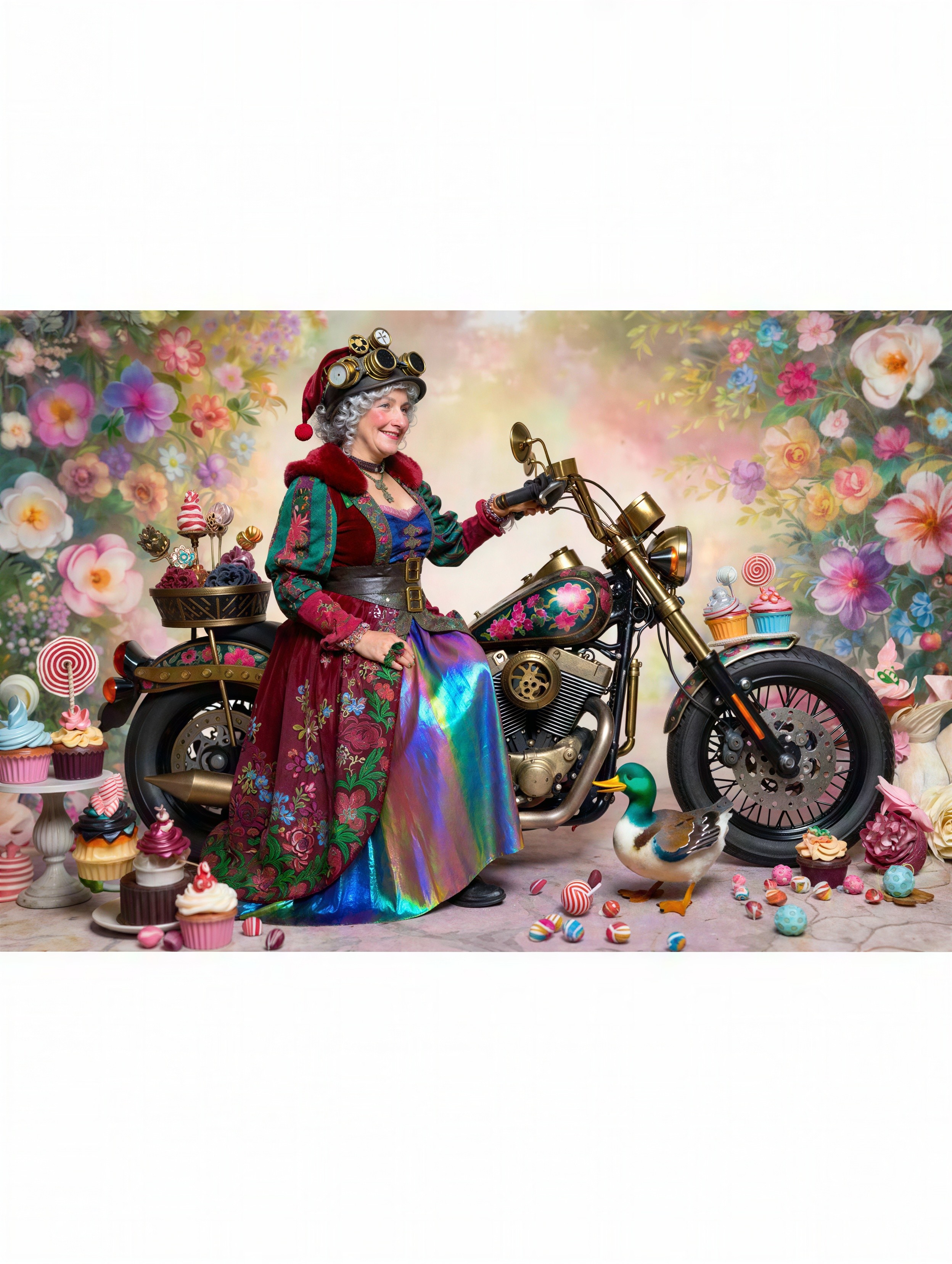 Prompt: Steampunk Mrs Santa Claus Biker in a colorful and ornate dress with floral patterns, on a soft and floral background. Decor Candy and cup cake. 3D. iridescent, Warm and comfortable lighting highlights the details, creating a magical and welcoming atmosphere. fantasy, bright, colorful, acrylic art, sharp focus. A little playful duck plays next to him.