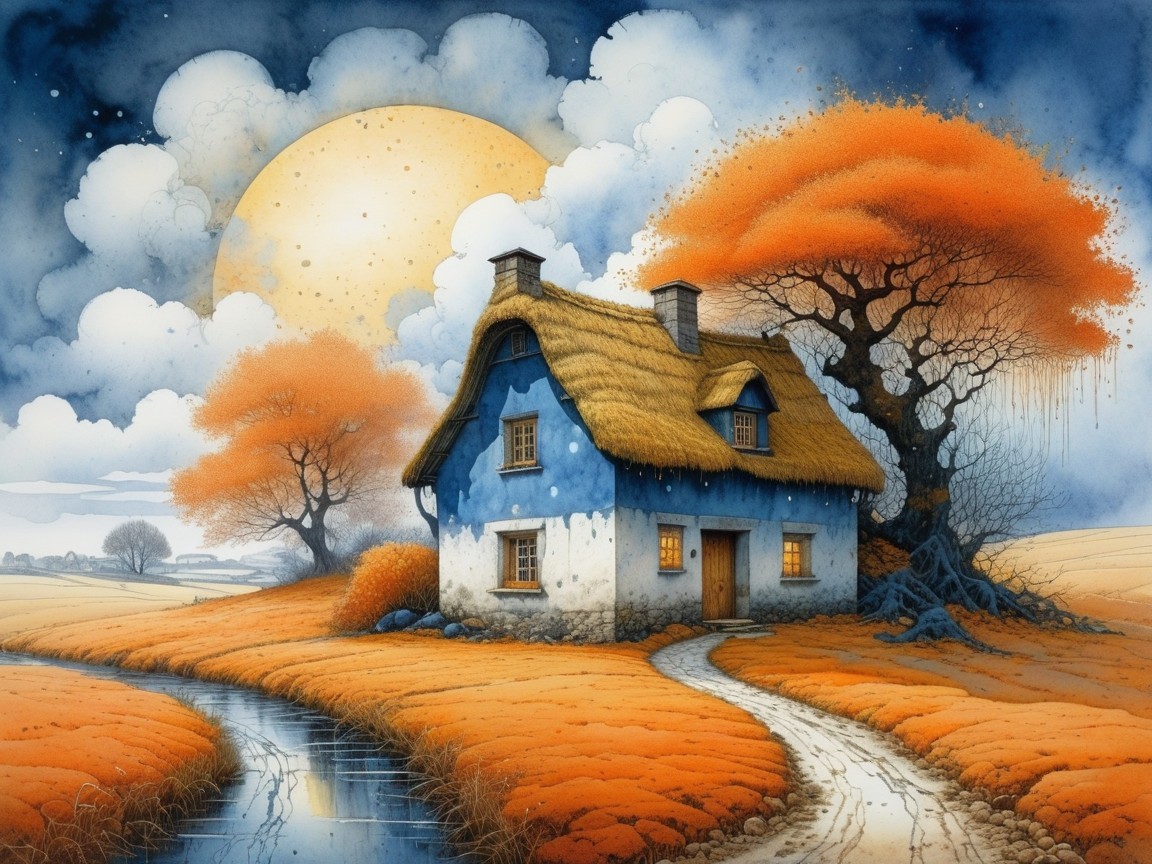 Prompt: Zdzisław Beksiński, Jacek Yerka and Yossi Kotler style mix: "surreal, whimsical autumn landscape covered in first frost, dramatic clouds, thatched cottage", watercolour and ink illustration, wet-on-wet, loose water effects, white, prussian blue and orange paint splatter, golden voronoi pattern, richly textured, by Susanne, vibrant triadic colours, opalescent gradient.