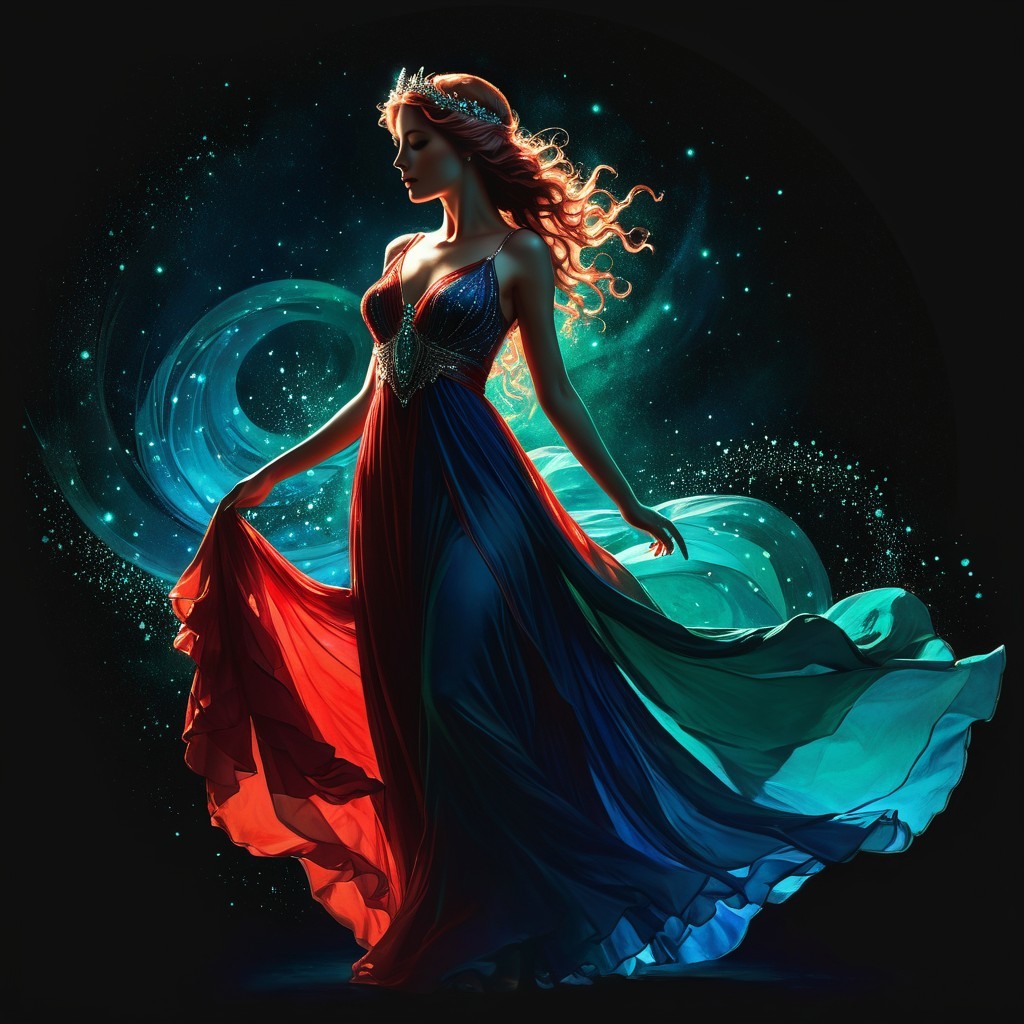 Prompt: Alphonse Mucha and modern fantasy art. Silhouette of a magical woman in a flowing red and blue dress, glowing emerald particles, dark background, cinematic lighting, fantasy art, ethereal, digital painting, high detail