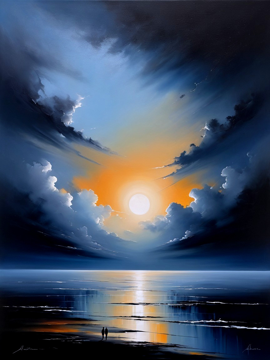 Prompt: Alison Johnson. A fragile silhouette in a vast space, lost, taking shape. Into the infinite depths, abstract, melancholic atmosphere, vibrant hues and oils on canvas. The immensity of the world. Ephemeral and powerful, a lost glow in infinity, solitude and beauty suspended in time.