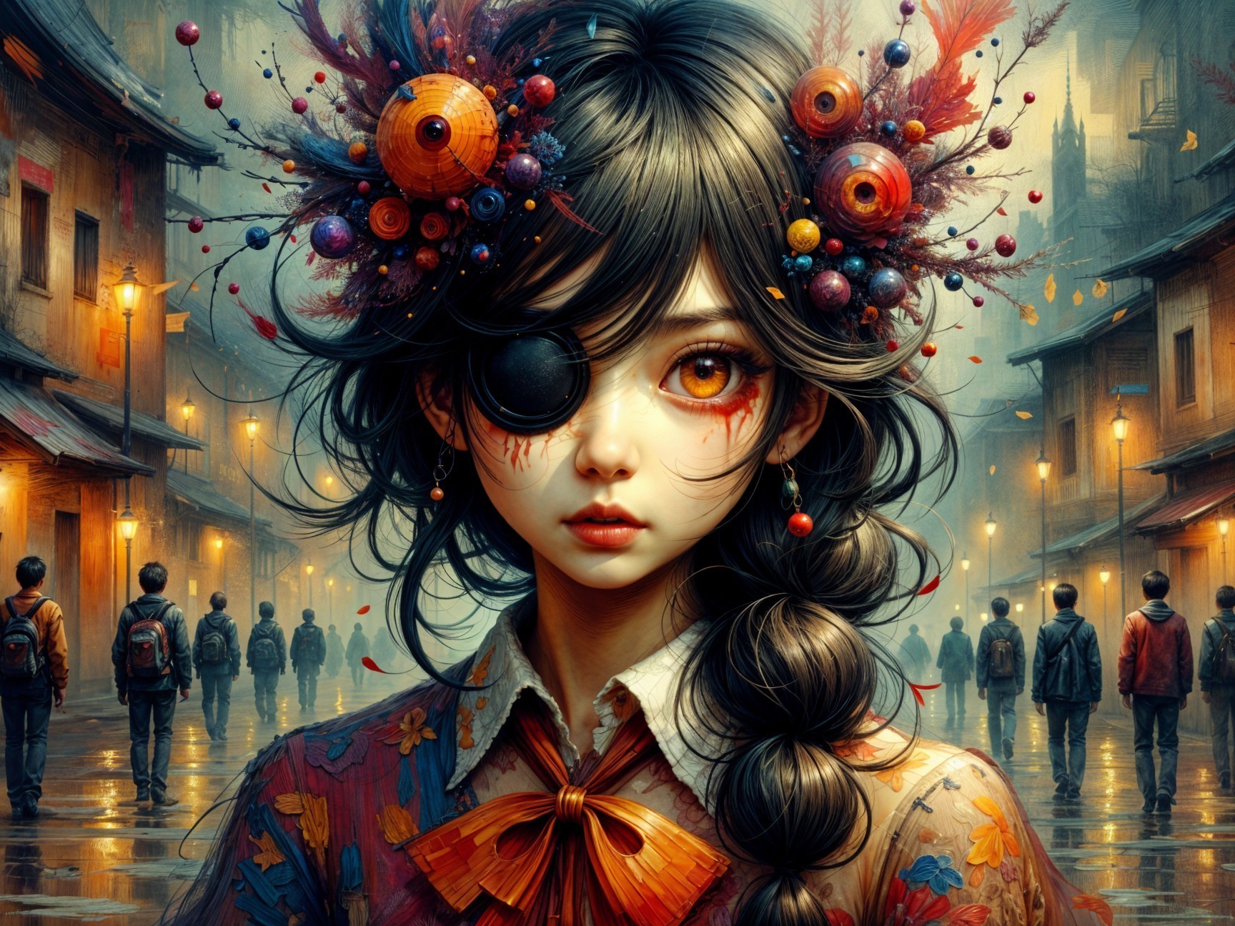 Prompt: Japanese high school setting, Asian teenager, short black hair, eye-patch, half human half ghoul, internal conflict, supernatural elements, red left eye when hungry, intense expression, dark ambiance, intricate Japanese school uniform, urban background, manga style illustration, detailed character design, emotional depth, by Sui Ishida, Artstation.