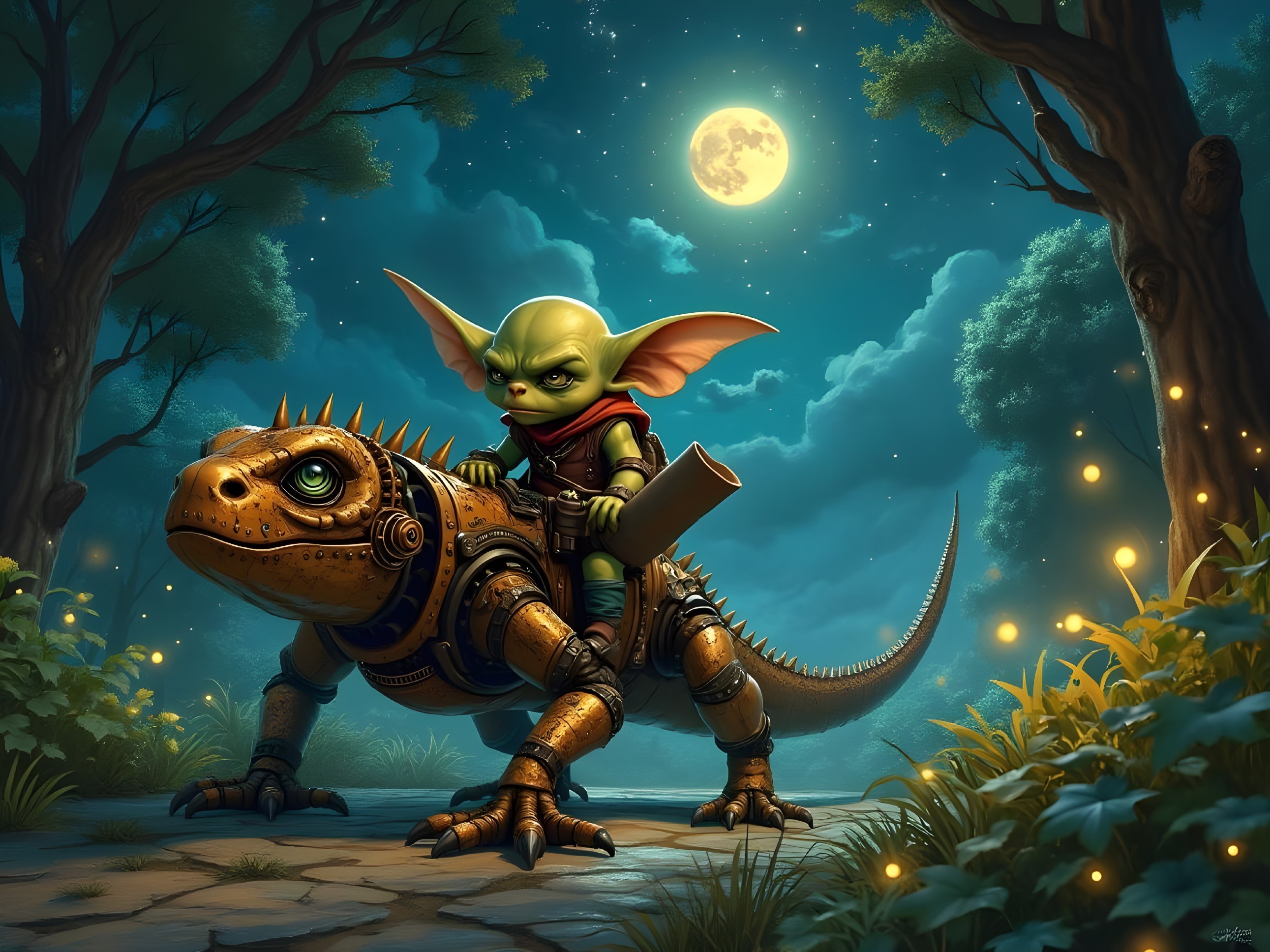 Prompt: Under a starry night sky, a goblin-like creature with exaggerated features, including large, pointed ears and an angry expression, rides a giant mechanical steampunk lizard, complete with lizard skull and darting tongue, along a shimmering path. Moonlight reflects off damp leaves, and the trees arch protectively above. Fireflies flutter, creating an otherworldly glow. The goblin carries a scroll in his right hand and gazes straight ahead like an explorer on a sacred quest. Every detail—from the gears to the worn leather saddle—tells the story of a quiet adventure. Style by: Tony DiTerlizzi, Rien Poortvliet, Terryl Whitlatch, Aaron Beck, Dominic Qwek—detailed, atmospheric fantasy with rich colors.
