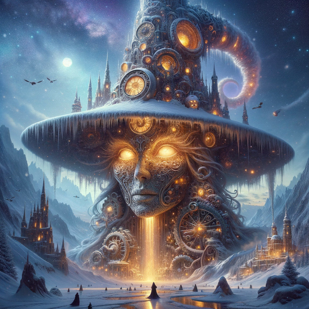 Prompt: A breathtaking fairy tale fantasy scene depicting a colossal witch’s head merged with a mechanical tower, her glowing eyes radiating golden light beneath a snow-covered wizard hat. The tower is alive with gears, pipes, and glowing windows, set in a frozen winter landscape under a starlit night sky. A grand castle rises in the background, illuminated by warm firelight. Tiny figures in cloaks approach the towering structure through mist and frost. The artwork feels otherworldly and magical, blending steampunk fantasy with enchanted realism — cinematic, mysterious, and beautifully surreal.