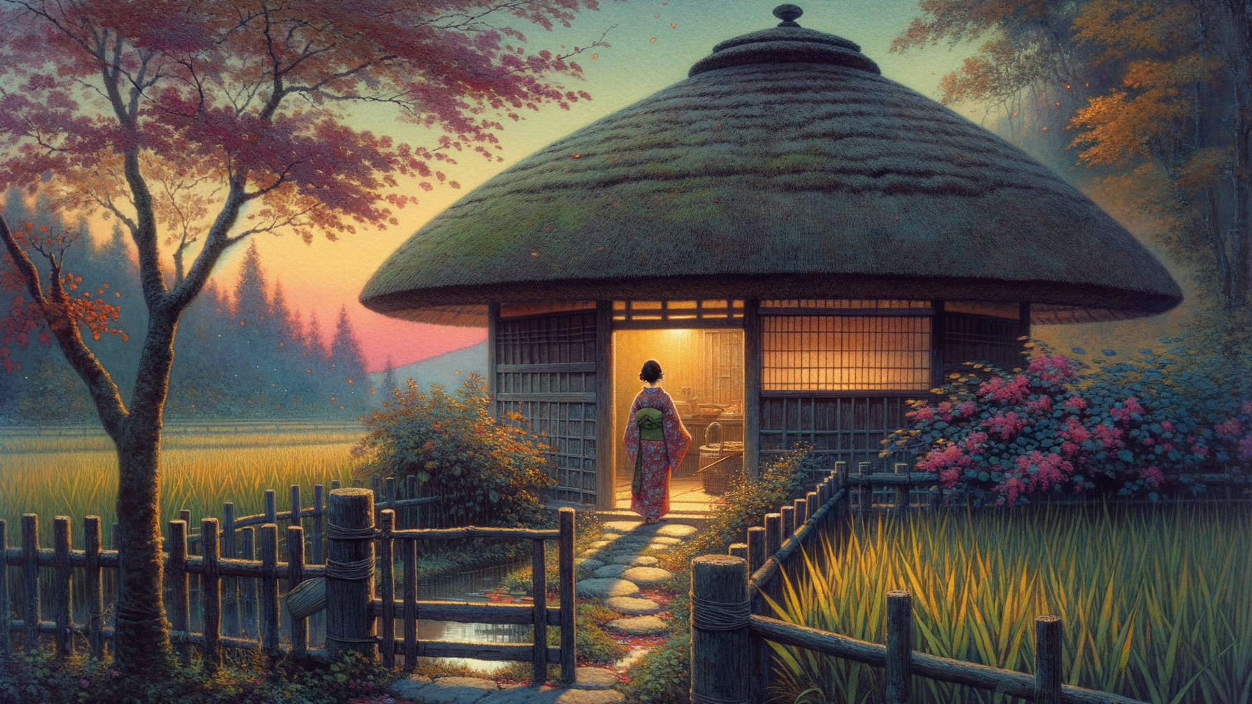 Prompt: Full screen, full width, wide, 16:9 format, wet-on-wet watercolor, transparent, From Dainagon Tsunenobu, poem 71 by Ogura Hyakunin Isshu: "When evening falls, / From the rice leaves at my door, / Light tapping is heard, / And into my round thatch hut, / The wandering breeze of autumn enters." A round thatch hut sits in a small garden surrounded by a simple wooden fence. Outside the fence are ripe, yellowing rice plants, which the autumn wind gently blows against the gate within the fence. Evening falls, and candlelight filters through the open door, illuminating the hut. At the edges of the sky, the deep blue of night approaches. The horizon is pink, magenta, and yellow. A lovely scene emerges on this beautiful autumn evening. A painting, masterfully rendered in wet watercolor with quick, deft brushstrokes, elegantly and perfectly captures the autumn atmosphere. A traditional Japanese landscape and a sexy Japanese girl in an elegant kimono