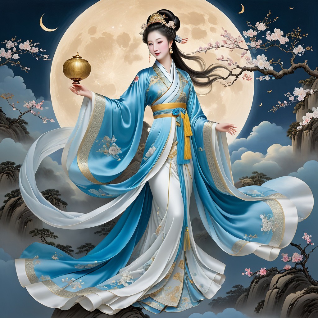 Prompt: A lavish gongbi-style painting of Chang’e (嫦娥) ascending to the Moon Palace, inspired by Qiu Ying’s meticulous brushwork and opulent color palette. Chang’e is depicted in flowing, layered silks—her robes dyed in soft celestial blues and whites, with intricate gold embroidery along the hems. Her hair is adorned with jade hairpins, and her face bears a serene, melancholic expression. She floats gracefully amid swirling clouds rendered in delicate ink washes, their edges tinged with silver to suggest moonlight.