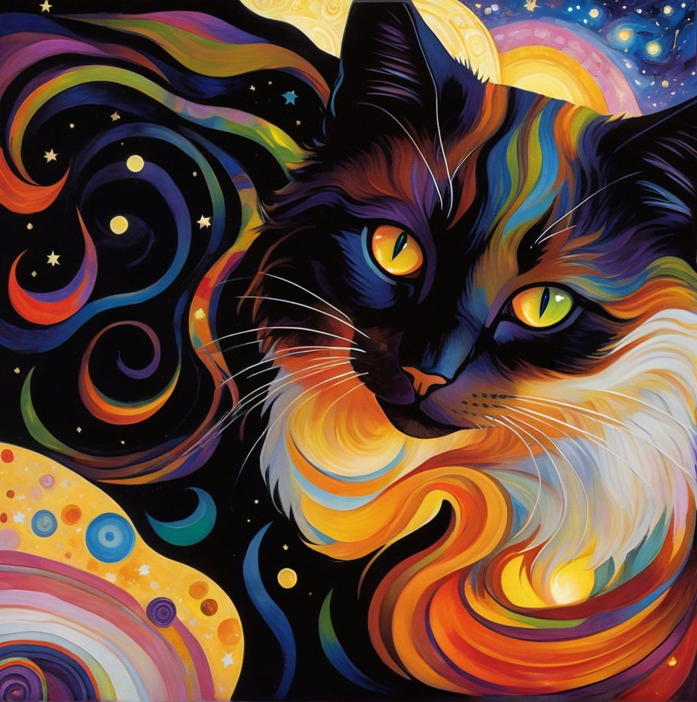 Prompt: A glorious cat with wavy hazy hair gazes thoughtfully. She wears a colorful psychedelic garment, and vibrant patterns swirl around her, set against a backdrop of whimsical starry night and a scenic landscape), By Hundertwasser, The piece should evoke a sense of wonder and awe,
