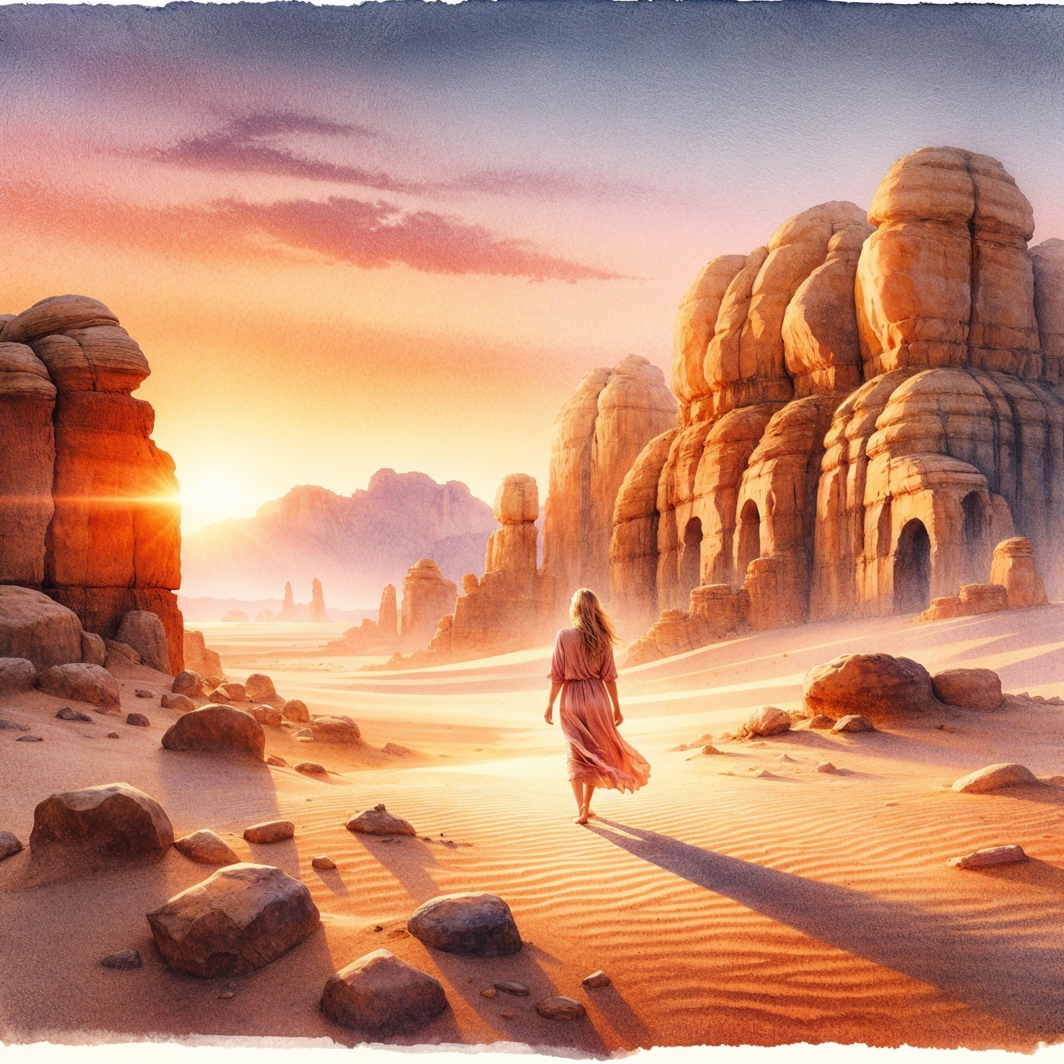 Prompt: Soft watercolor landscape showing the monumental sandstone cliffs and rock arches of AlUla glowing in golden evening light. A small blonde woman with pink glasses walks in the distance across the sand, her figure tiny against the vast horizon. Warm hues of orange, rose, and amber blend into the deep blue of dusk. The sky glows softly, and ancient wind-carved stones cast long shadows. The scene feels silent and sacred — a moment of peace between earth and sky.
