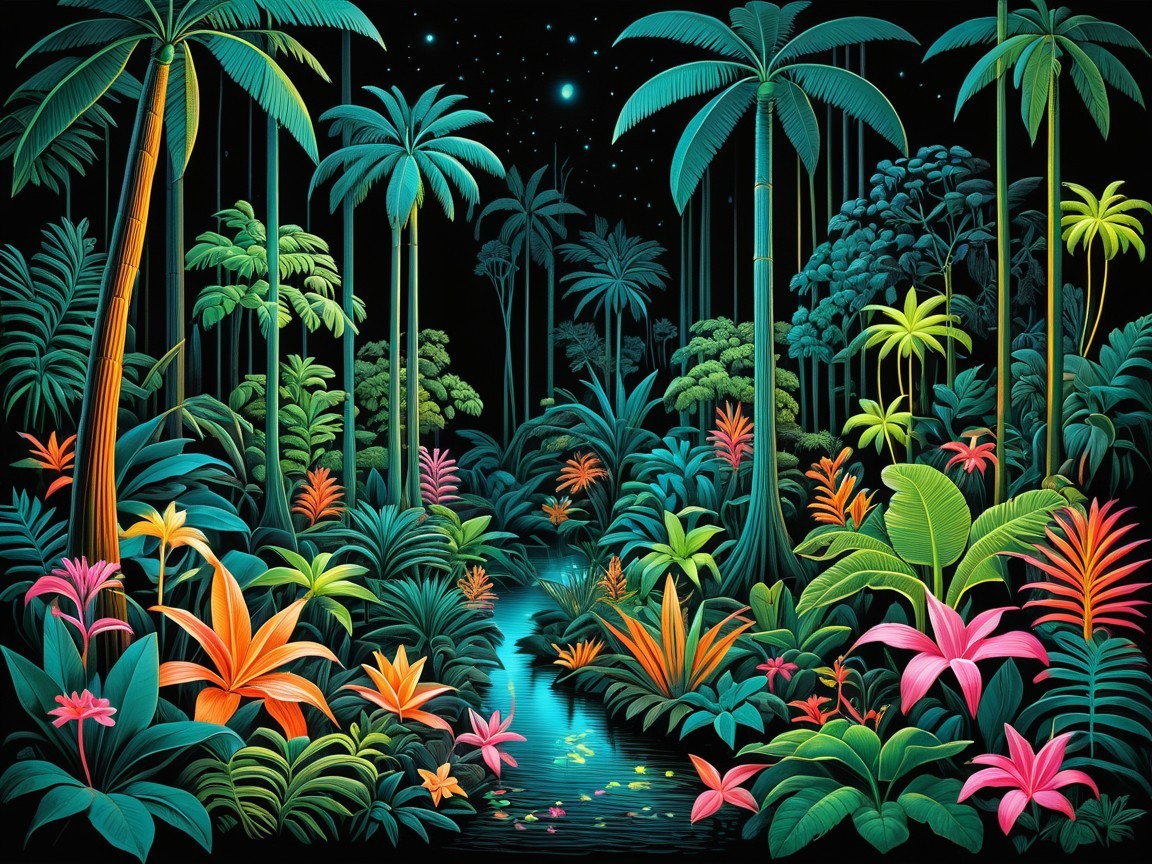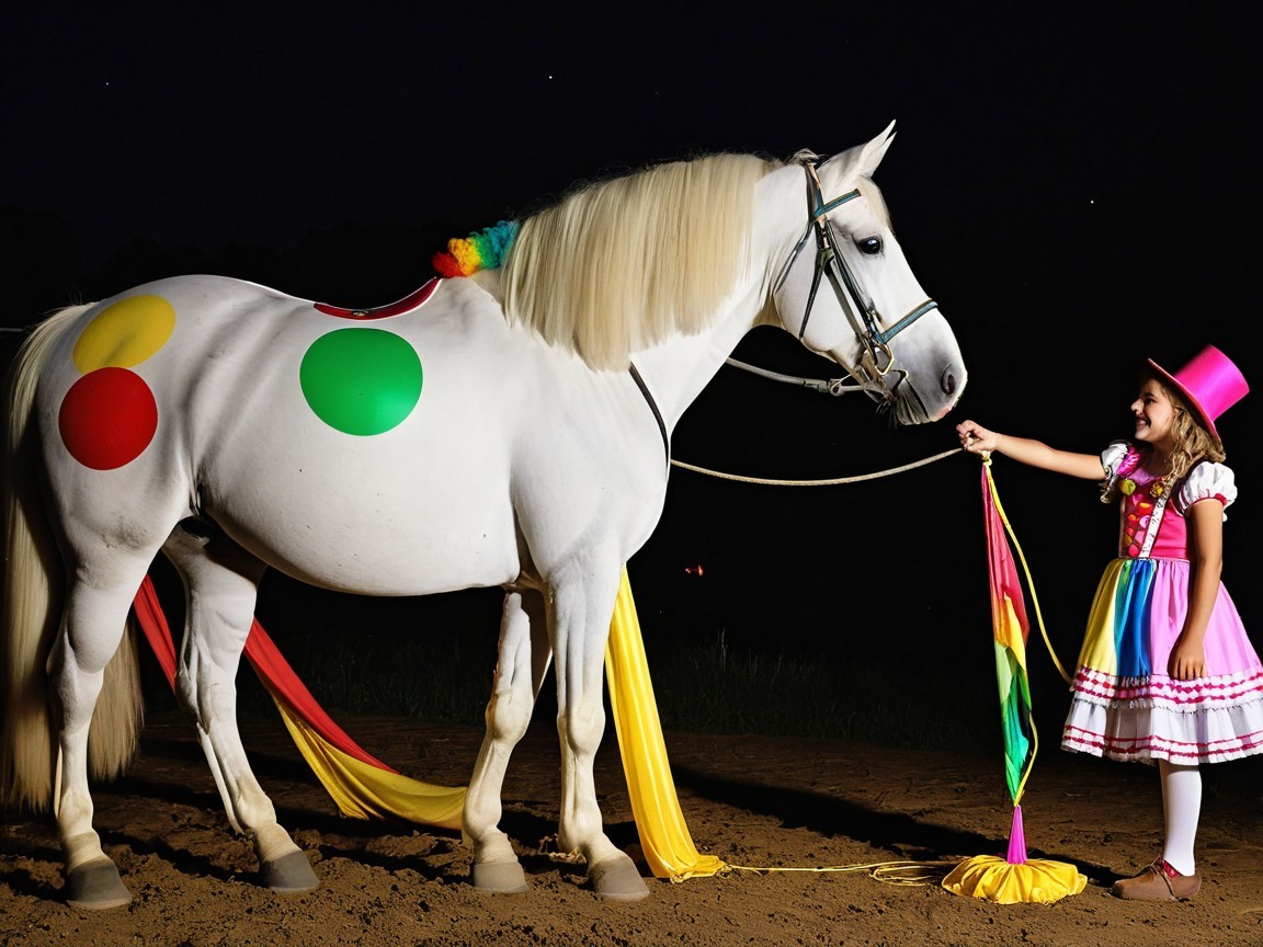Prompt: Una vivida esplorazione del circo equestre , dove le clown umane assaporano un arcobaleno di sapori. bambini e bambine fondono sapori floreali e cosmici, mentre una polvere argentata luminosa crea una vibrante festa visiva astratta.