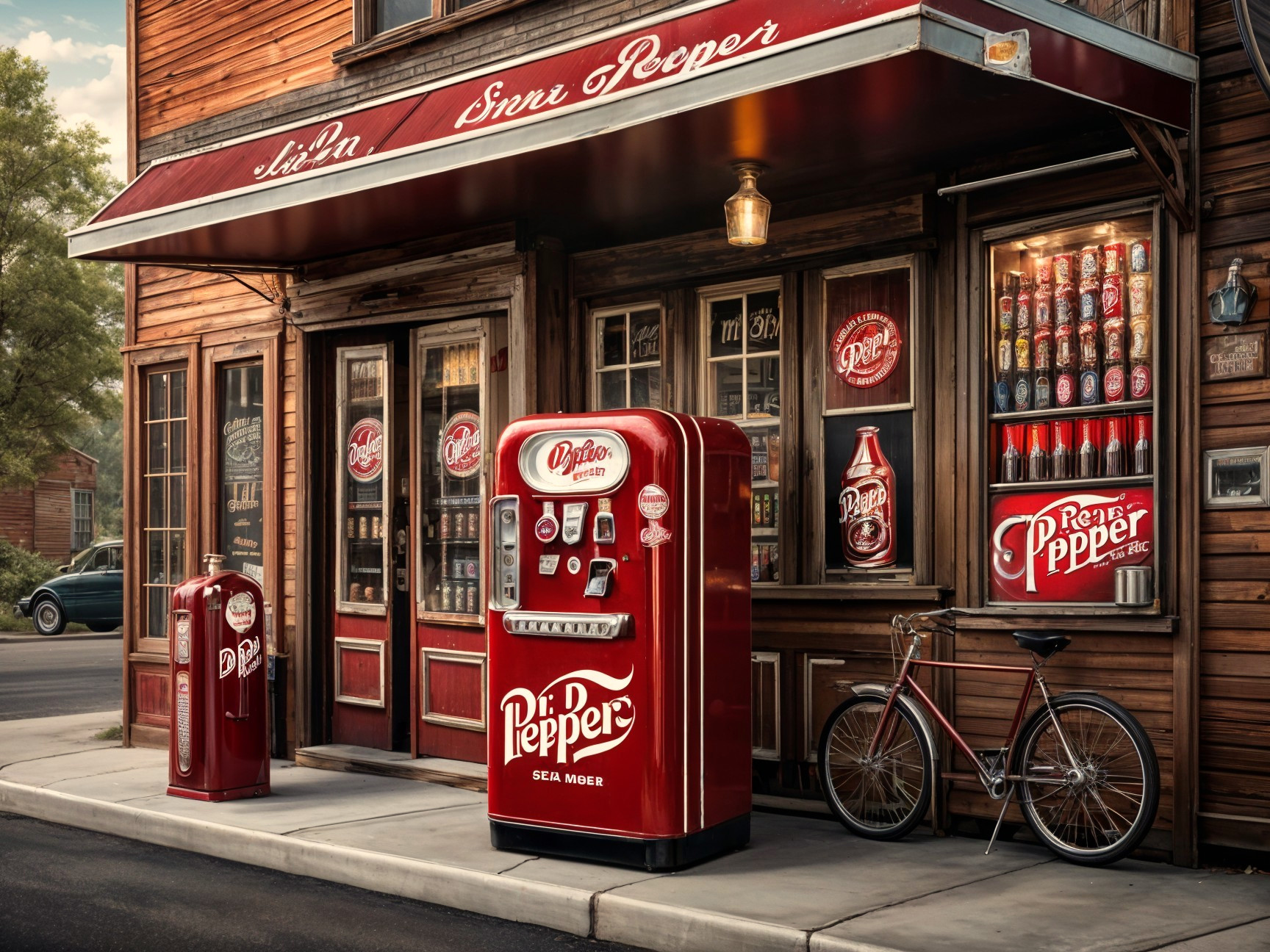 Prompt: the nostalgic charm of a vintage soda machines with this captivating image featuring a Dr Pepper vending machine outside a quaint shop, embodying the spirit of Americana.