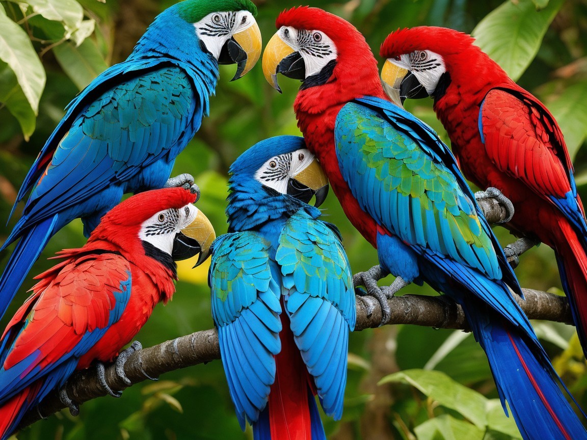 Prompt: A flock of vibrant macaws erupts from the rainforest canopy, red, blue, and yellow feathers in explosive contrast, wild and free.